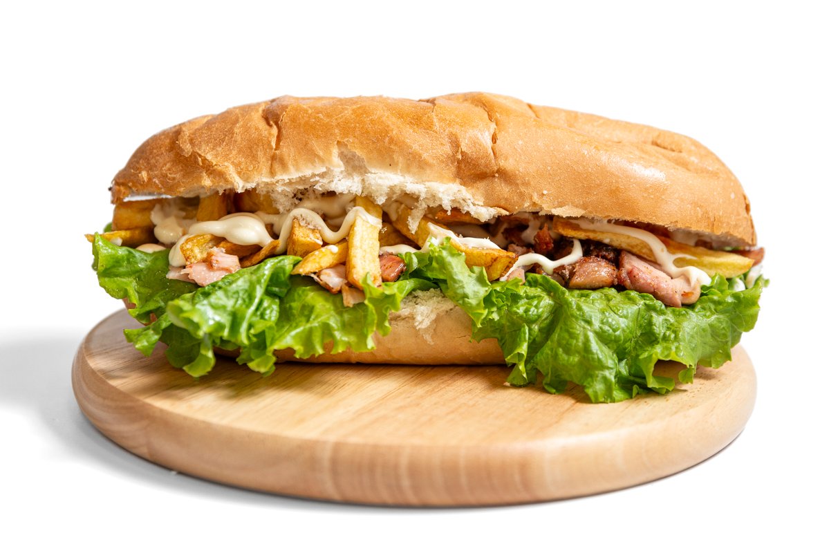 Свежий хрустящий батон, жаренная курица, свежие помидоры и листья салата и все заправлено нашим фирменным соусом