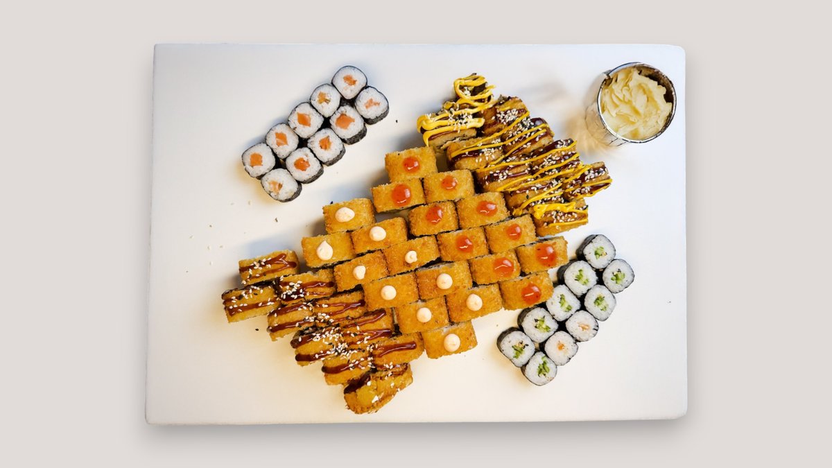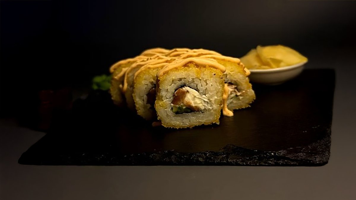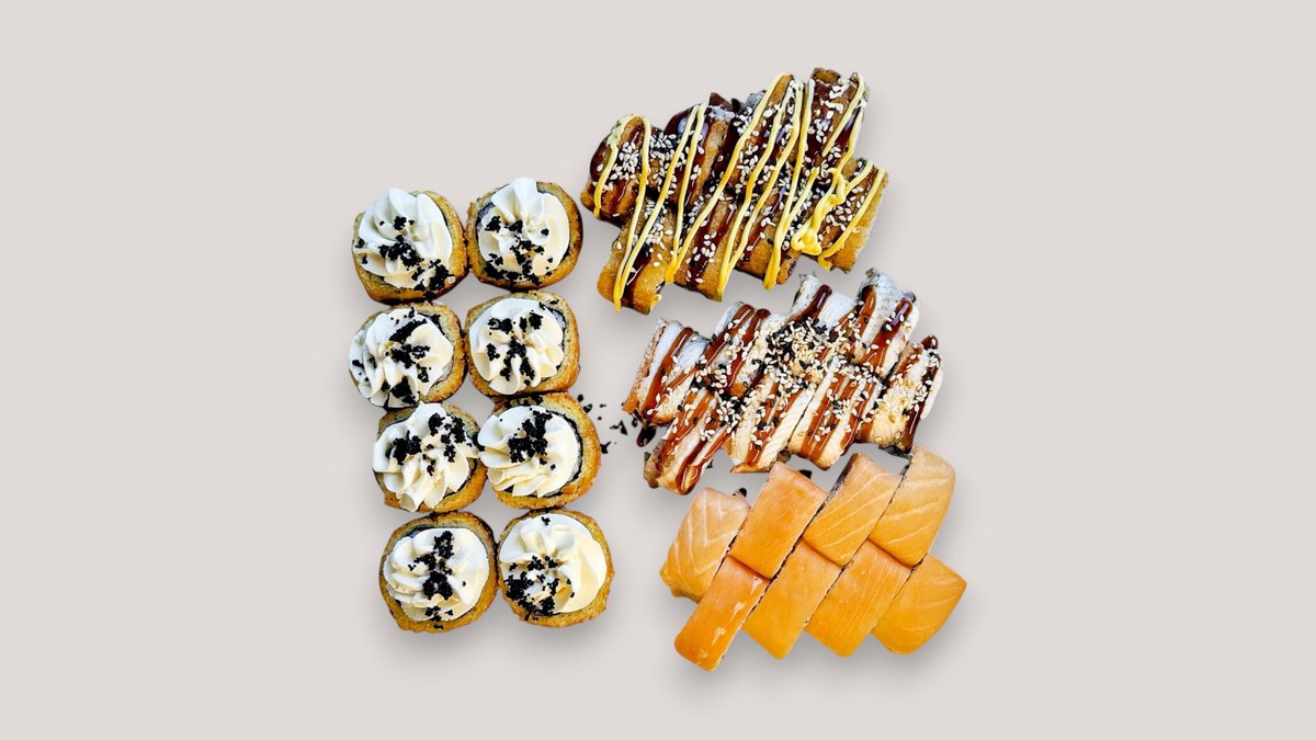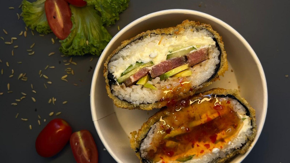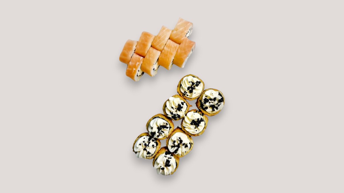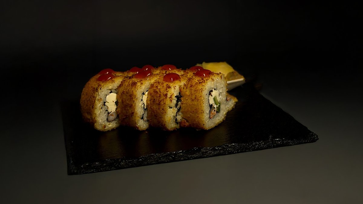 Состав: рис, нори, творожный сыр, лосось, тунец, кляр, панировочные сухари, сырный соус, соус унаги, соус свит-чили