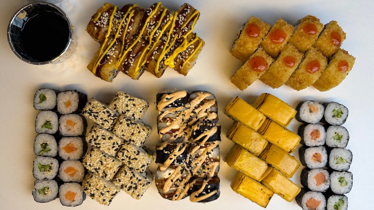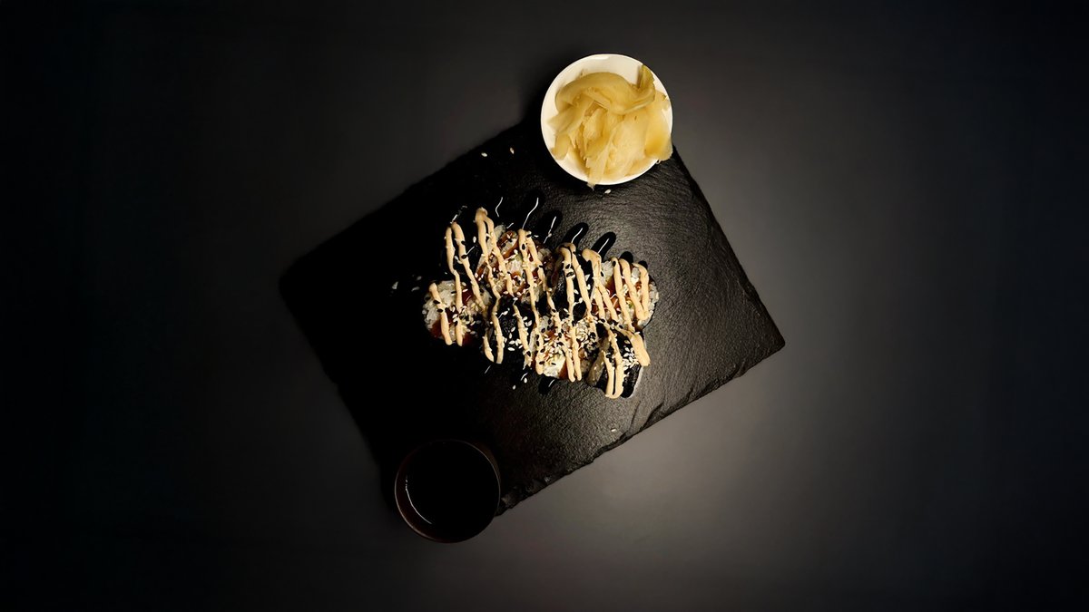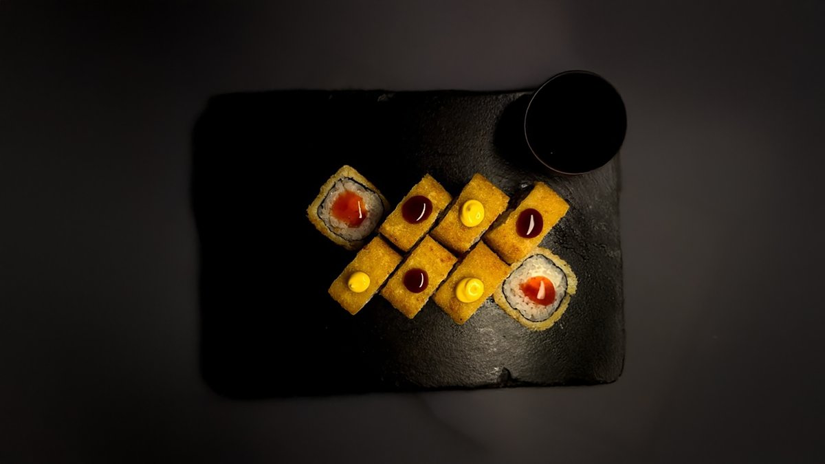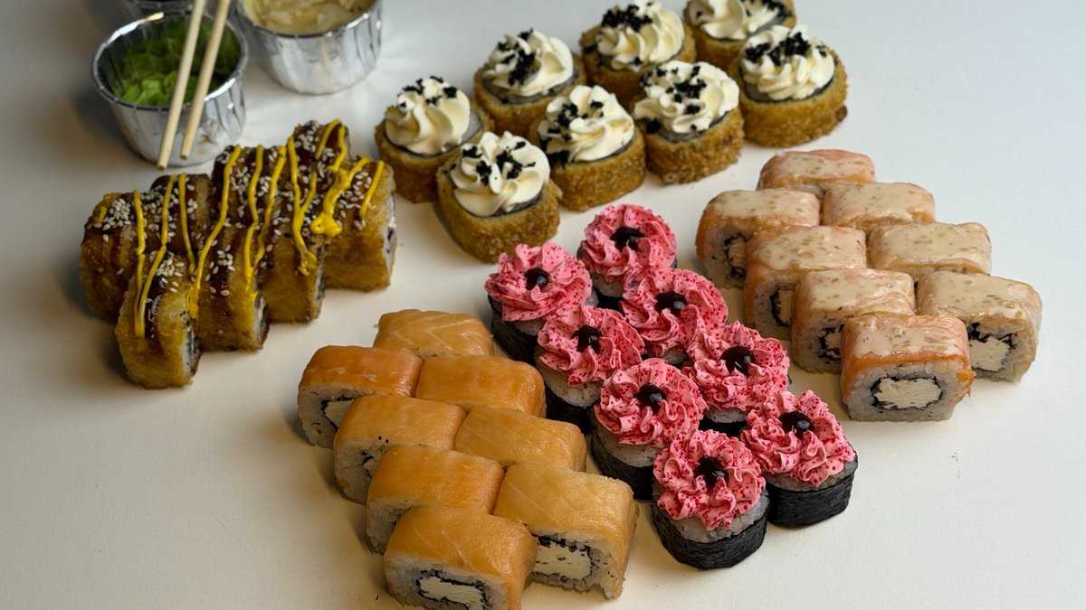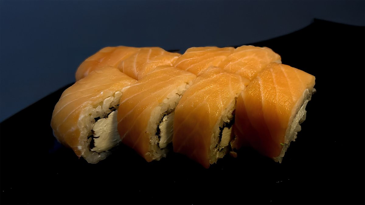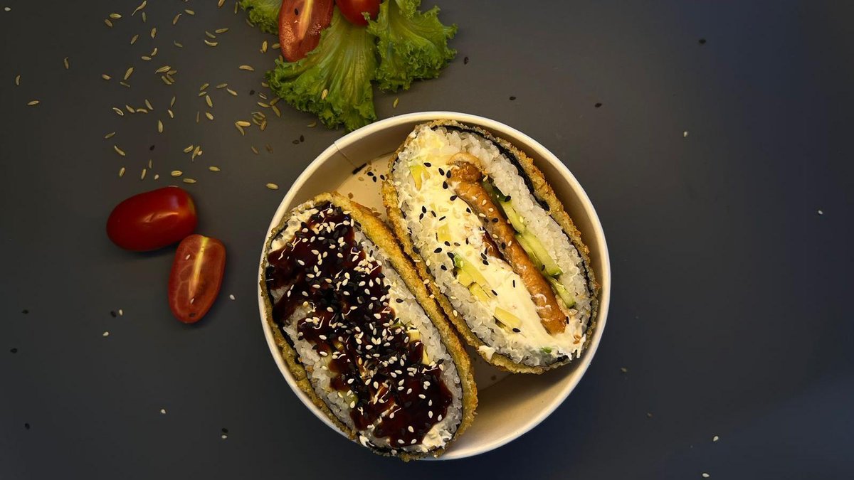 Состав: рис, нори, творожный сыр, лосось, тунец, кляр, панировочные сухари, сырный соус, соус унаги, соус свит-чили