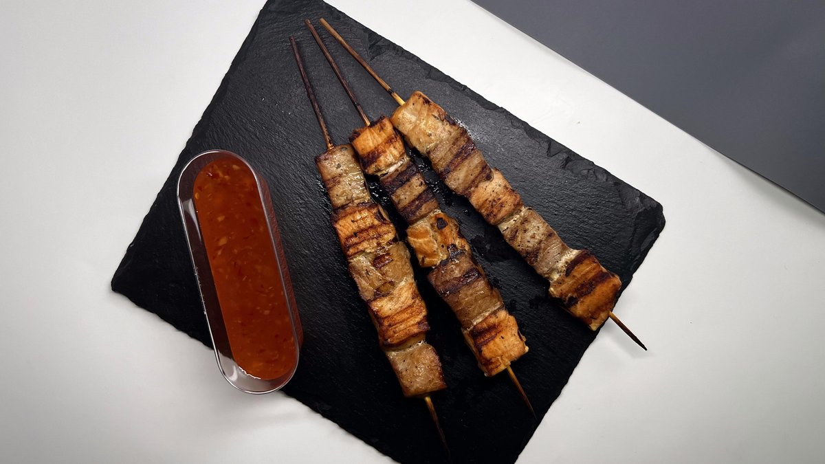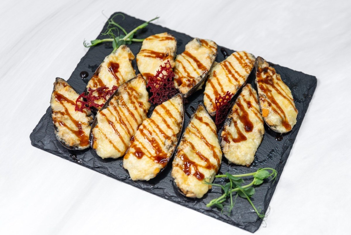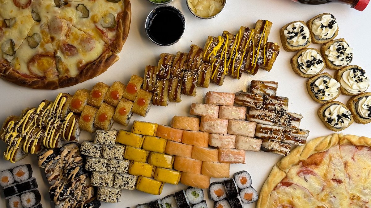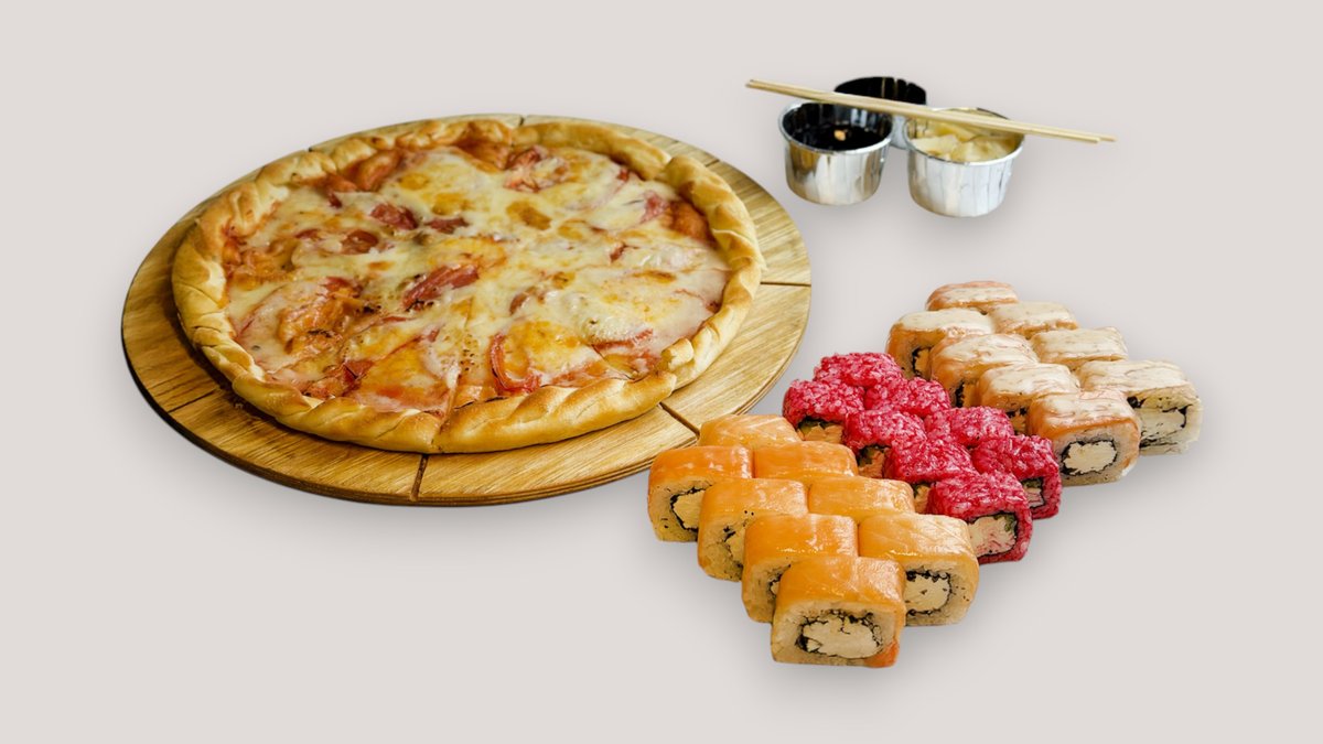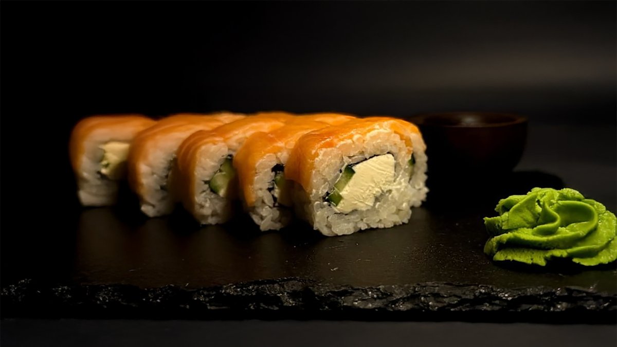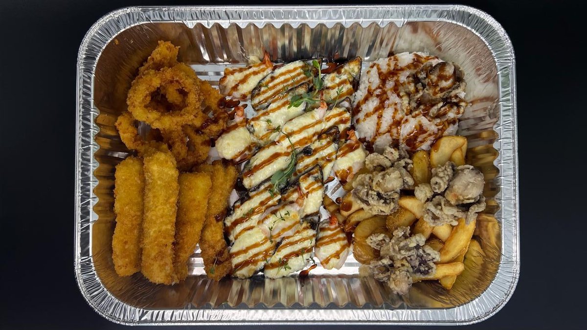 Состав: рис, нори, творожный сыр, лосось, тунец, кляр, панировочные сухари, сырный соус, соус унаги, соус свит-чили