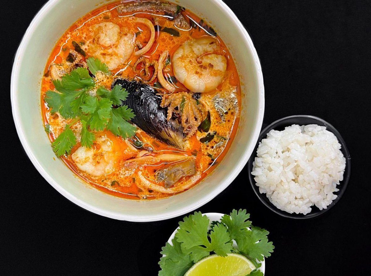 креветки, осминожки .кальмары, шампиньоны, кокосовое молоко , мидии, рис