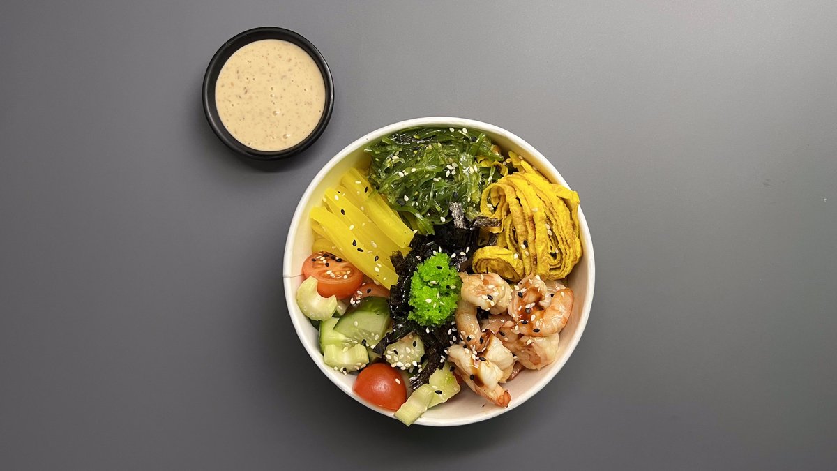 креветки, рис, дайкон, помидор, огурец, сельдерей , чука, томаго блинчик