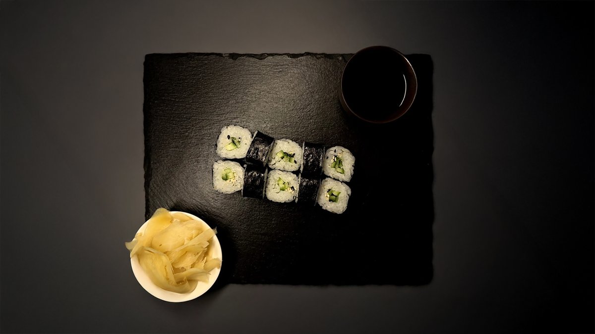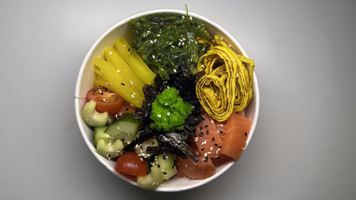 семга, рис . огурец, помидор, сельдерей , томаго блинчик, дайкон, чука