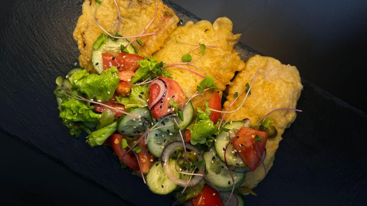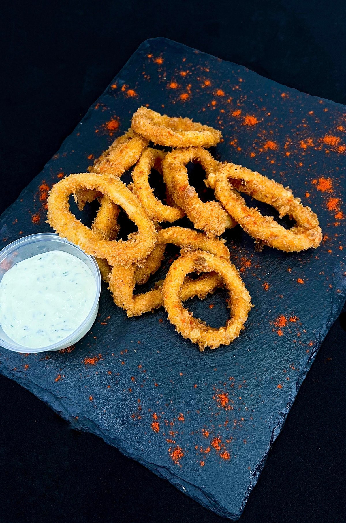 Мидии фаршированные рисом, кольца кальмара ,осьминожки , креветки в кляре, филе судака ,картофельные дольки,