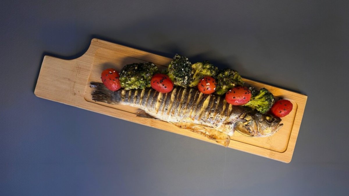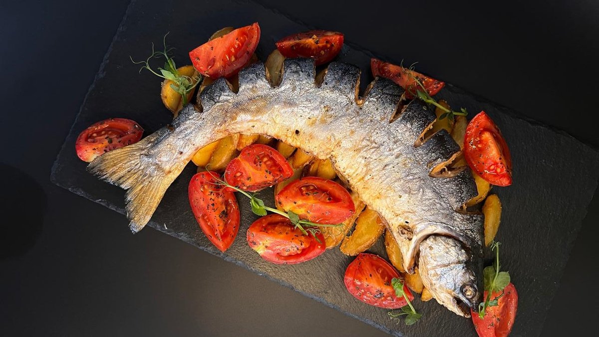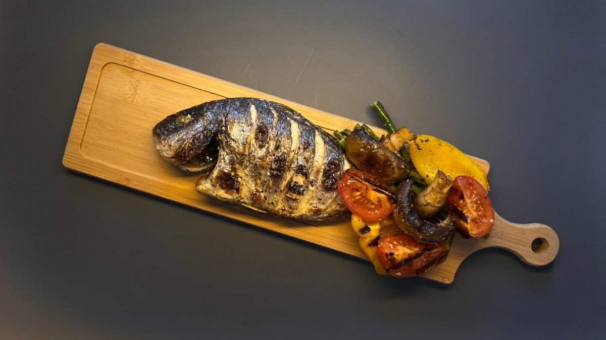 Дорада, спаржа ,грибы ,болгарский перец ,томаты