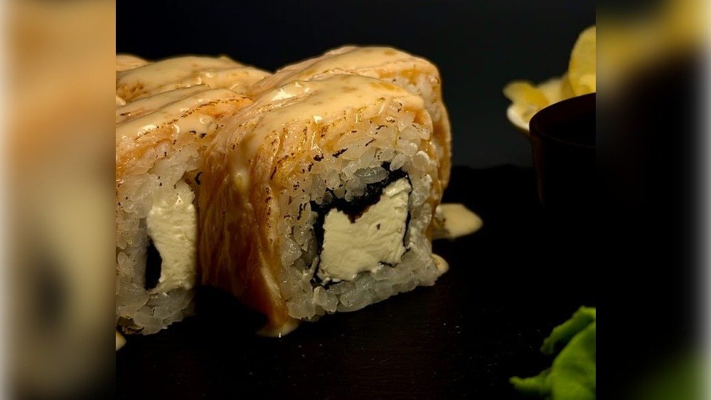 Состав: рис, нори, творожный сыр, лосось, огурец, спайси соус, кляр, панировочные сухари, спайси соус