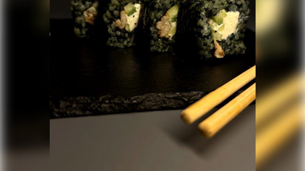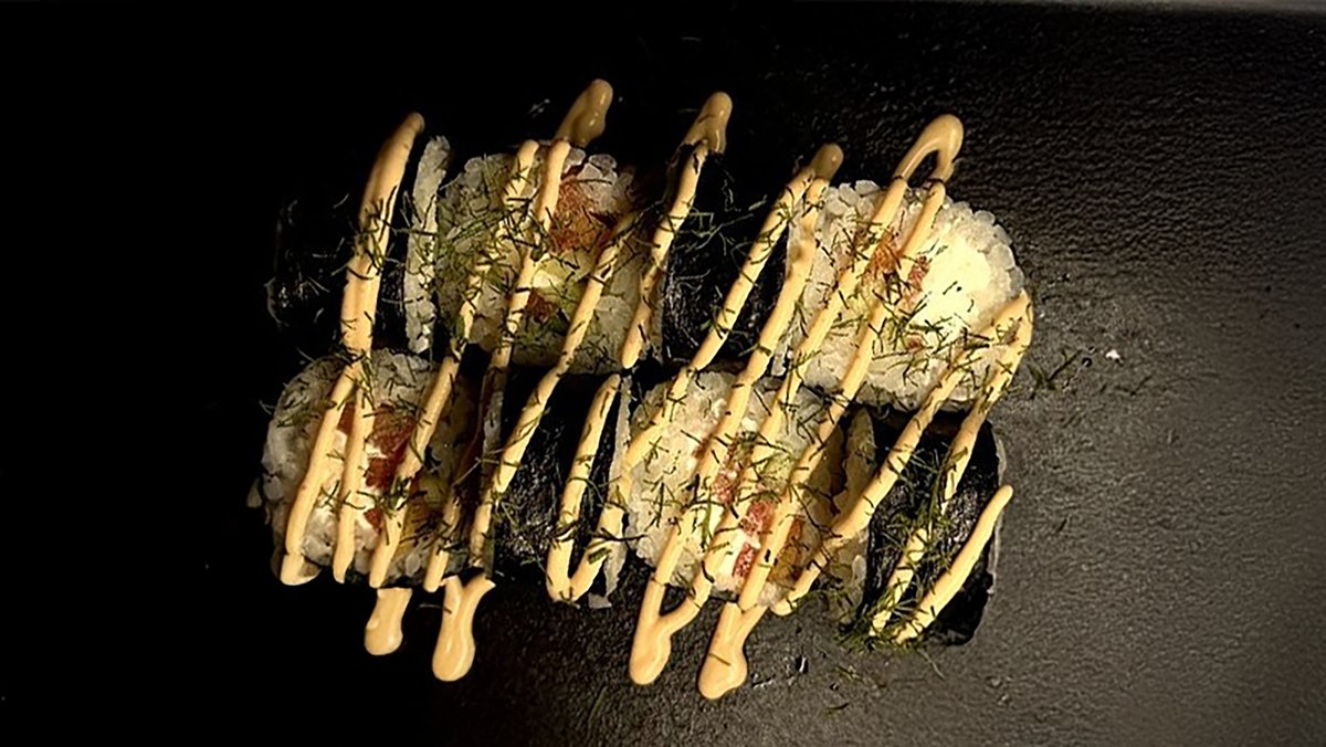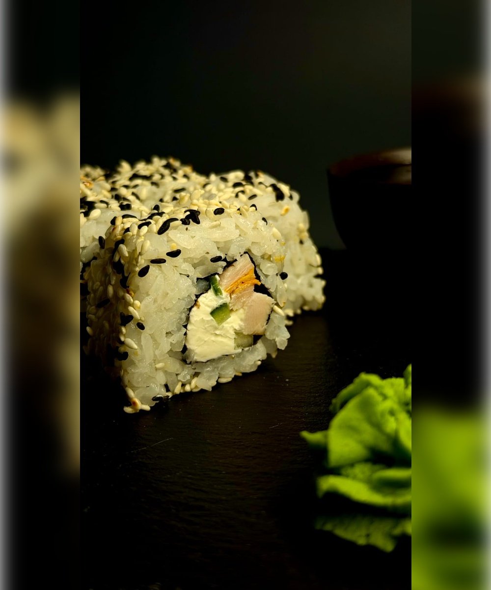 Состав: рис, нори, творожный сыр, помидор, копчёная куриная грудка, кляр, панировочные сухари соус унаги, сырный соус, кунжут