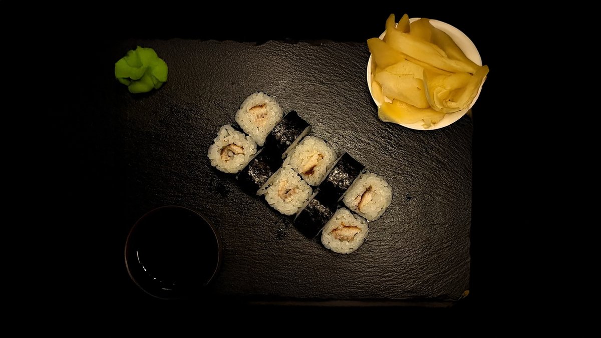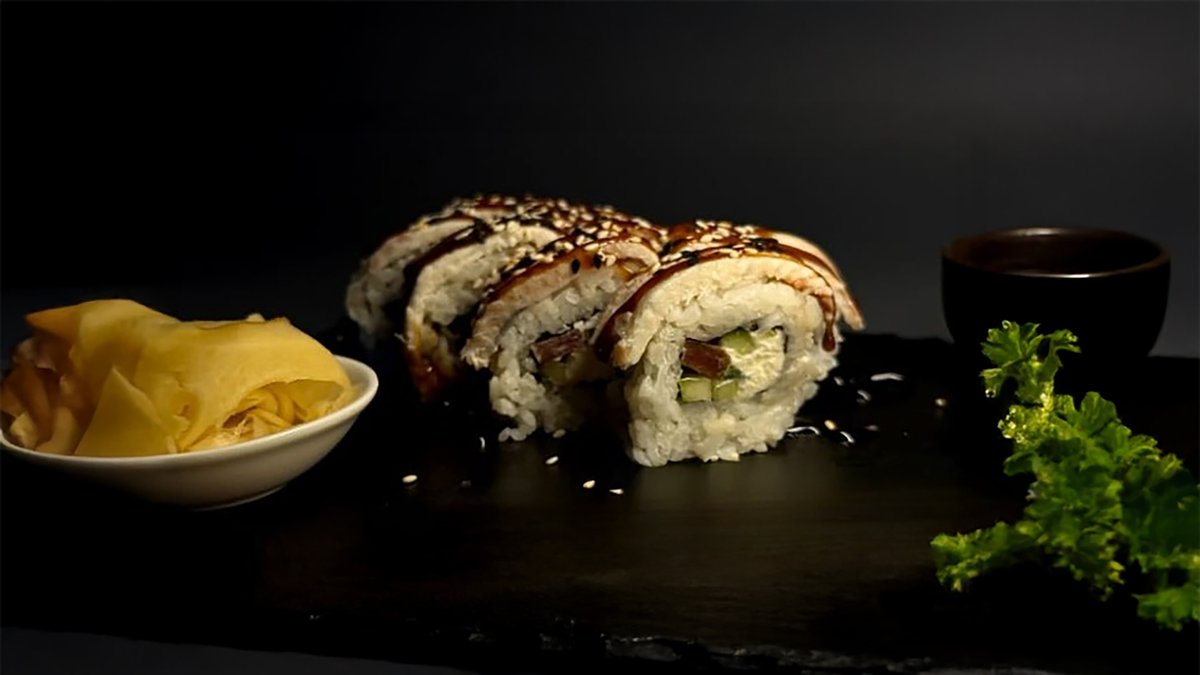 Состав: рис, нори, творожный сыр, огурец, угорь, кляр, панировочные сухари, соус унаги, кунжут