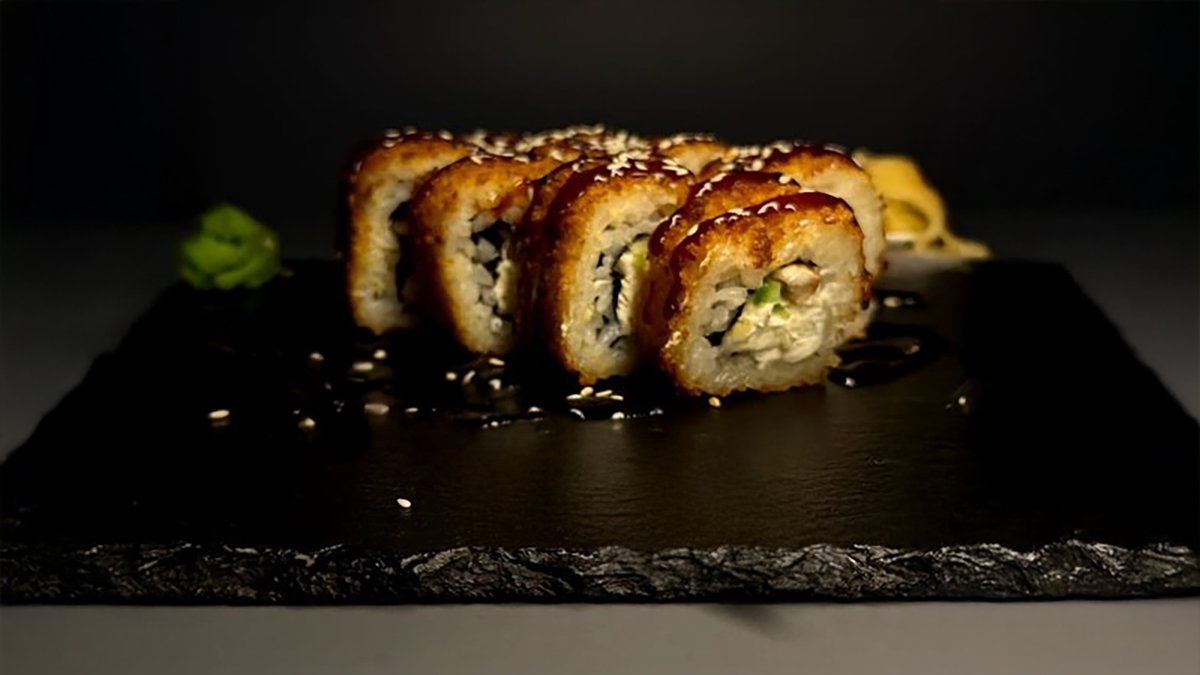 Состав: рис, нори, творожный сыр, огурец, лосось, кляр, панировочные сухари, соус унаги, кунжут