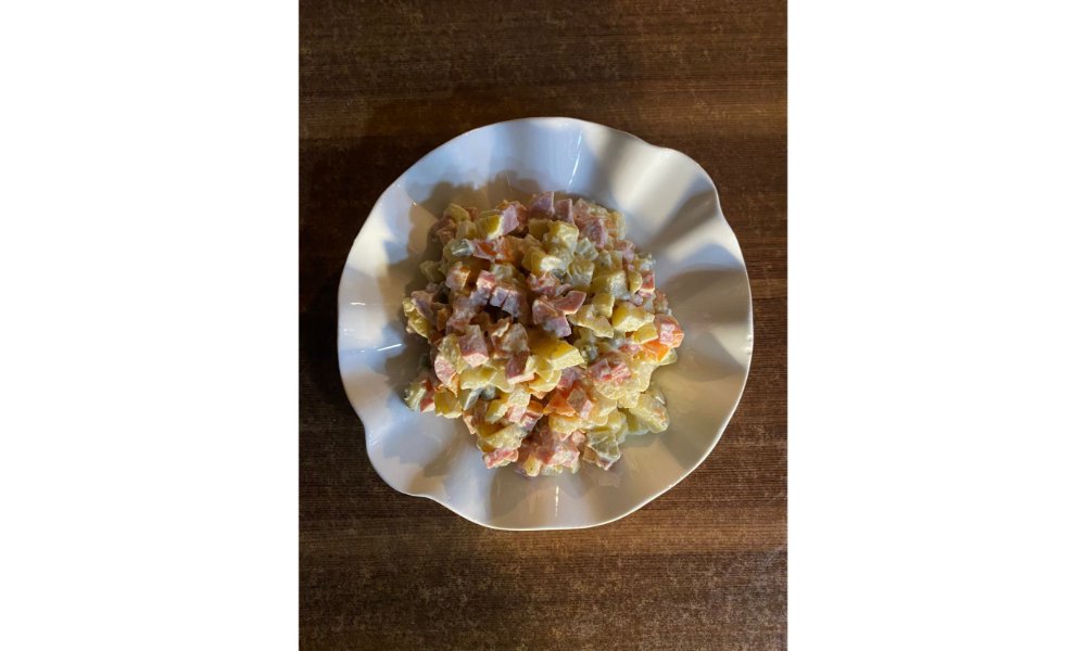 Картофель, морковь, вареная колбаса, яйца, огурцы, горошки, лук, майонез