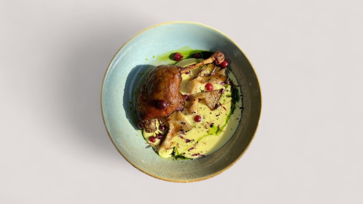 Подается с картофельным кремом, вешенками и маринованной клюквой