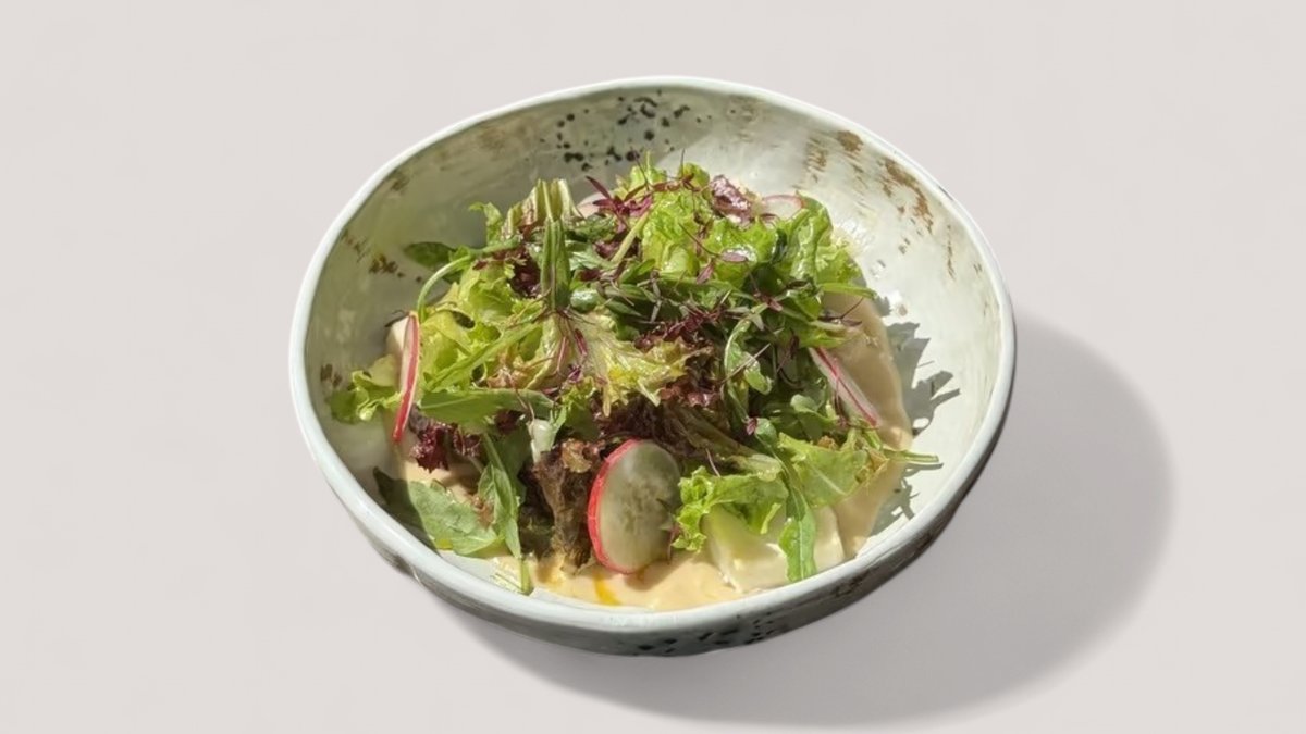 Обжаренные шампиньоны, опята и белый гриб, подаются с кремом из лука, суфле из хлеба и микс-салатом