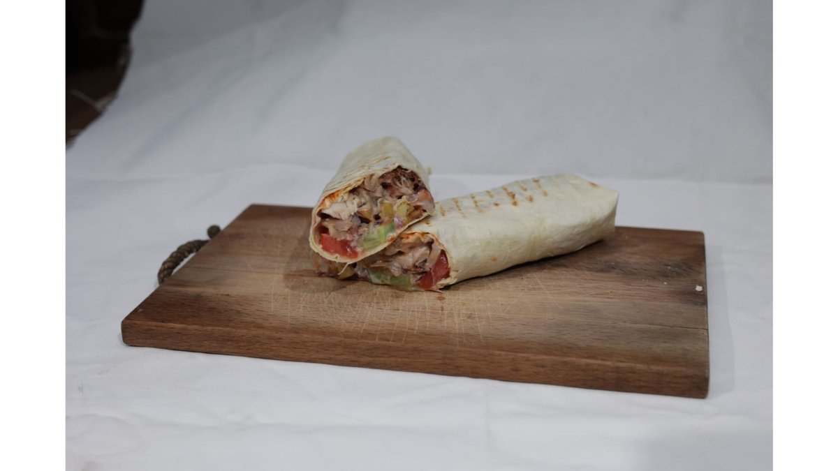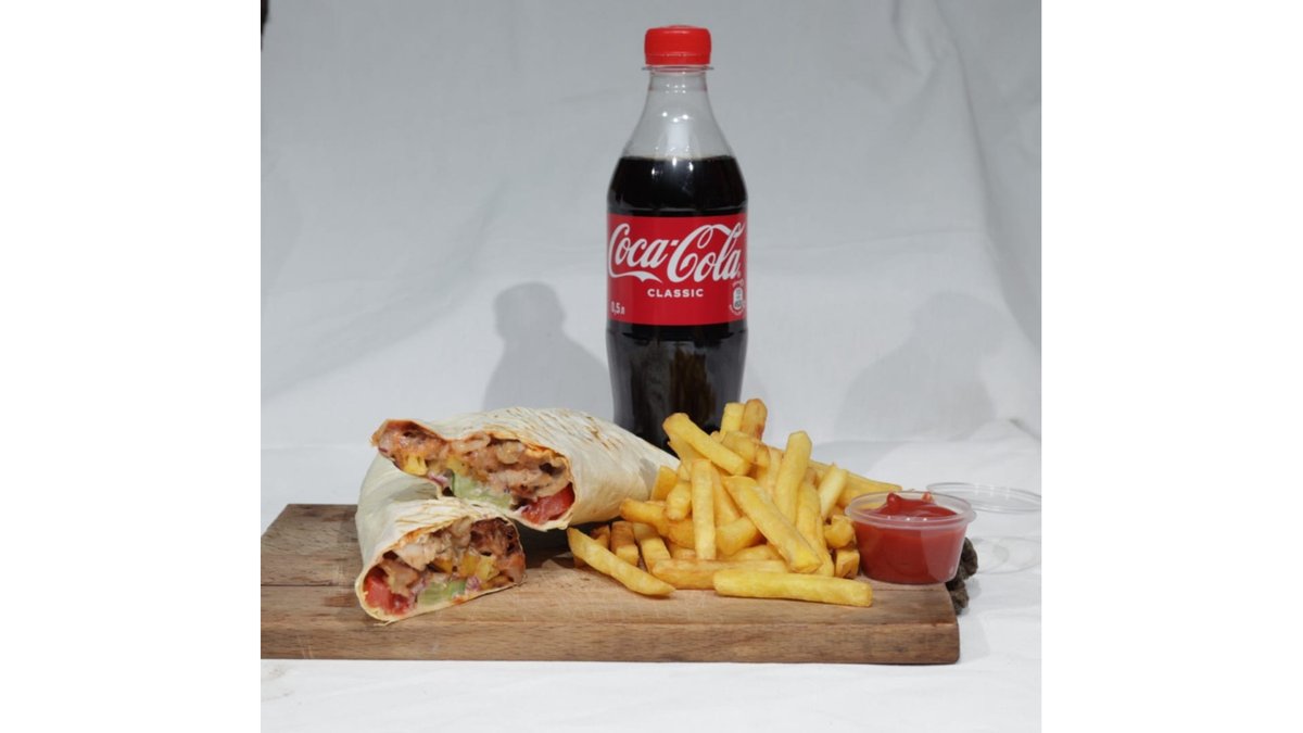 Лаваш, куриное мясо, свежие помидоры, огурцы, лук шалот, пекинская капуста, картофель фри, красный соус, белый соус.