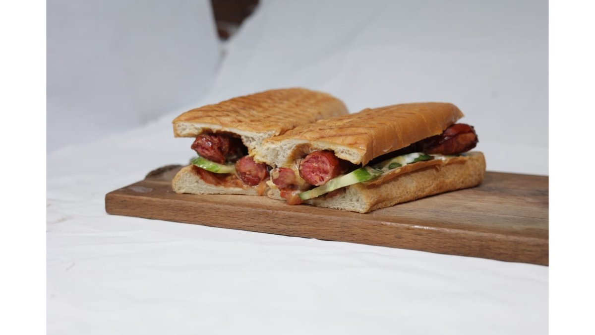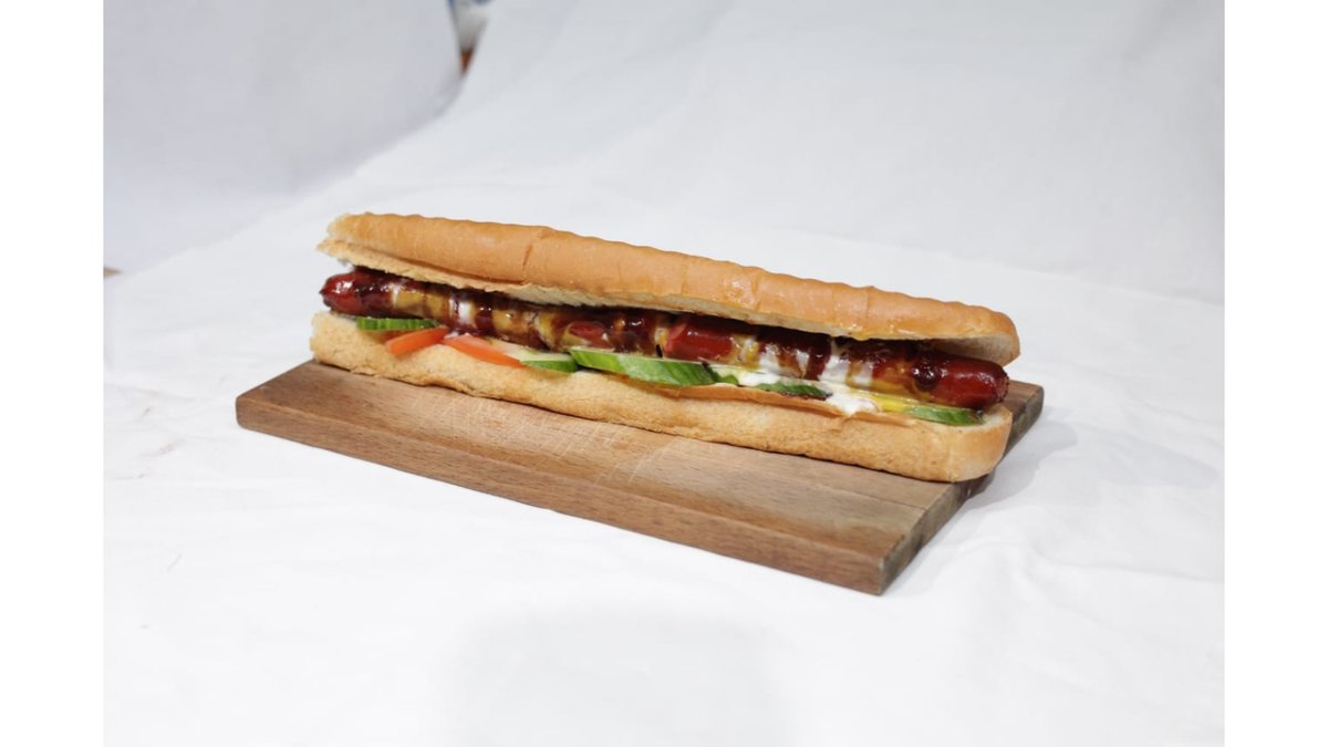 Булочка, 2 говяжьи охотничьи колбаски , свежие помидоры, огурцы, лист салата, 3 вида соуса (барбекю,майонез, горчица)