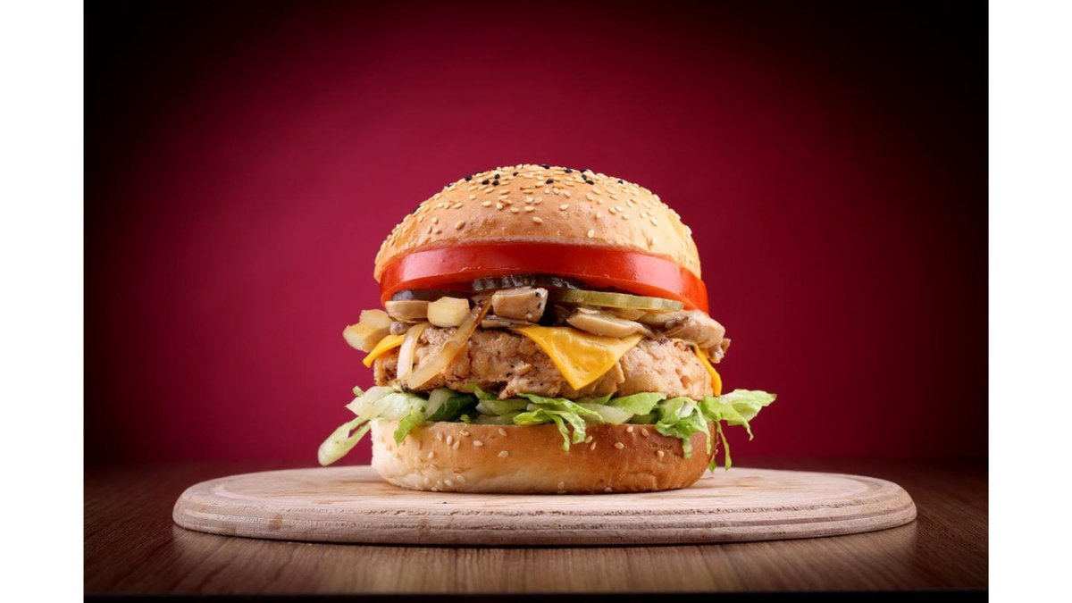 Куриная котлета, грибы на гриле, сыр чеддер, чесночный соус, карамелизованный лук, айсберг, помидор, соленый огурец, густо соус, болгарский перец, булочка