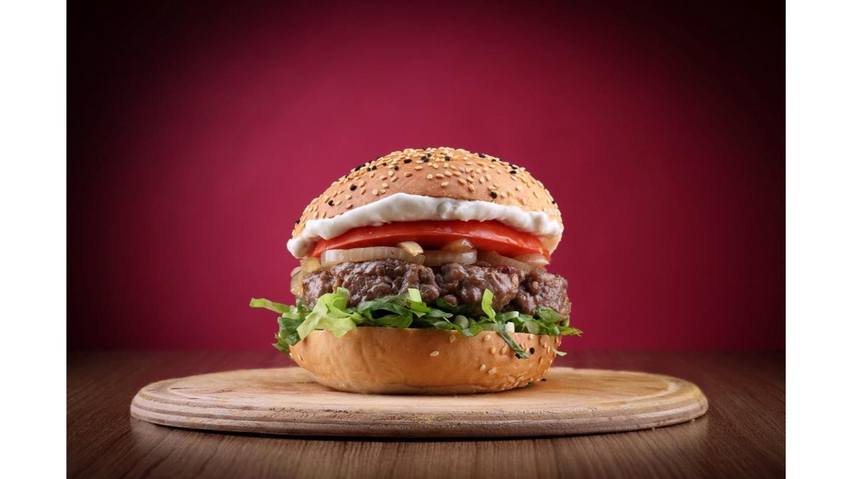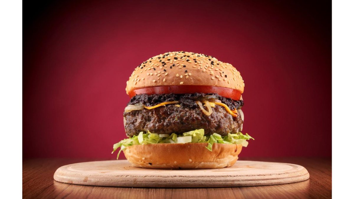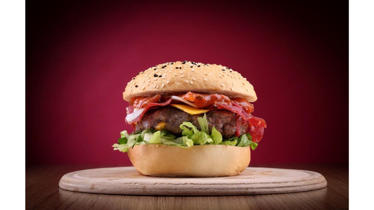 Говяжья котлета, халапеньо, фирменый острый соус, карамелизованный лук, айсбер, помидор, соленый огурец, густо соус, болгарский перец на гриле, булочка, сыр чеддер