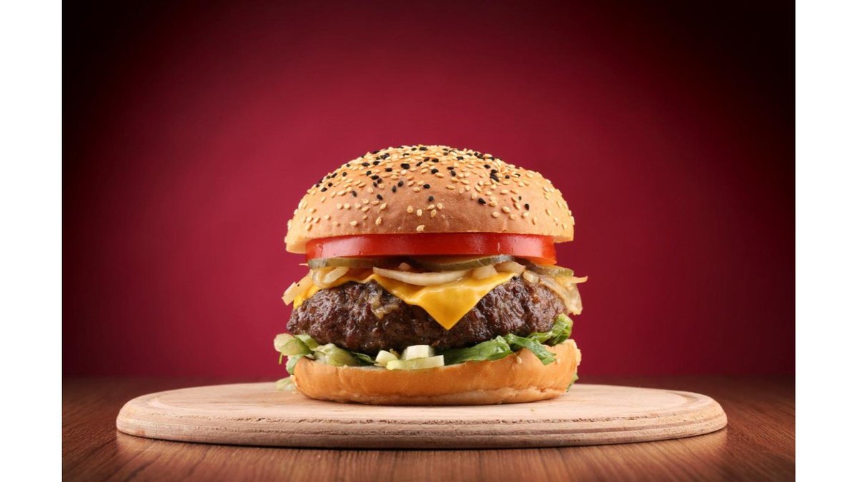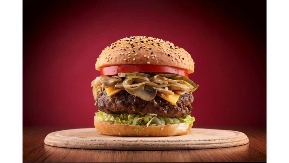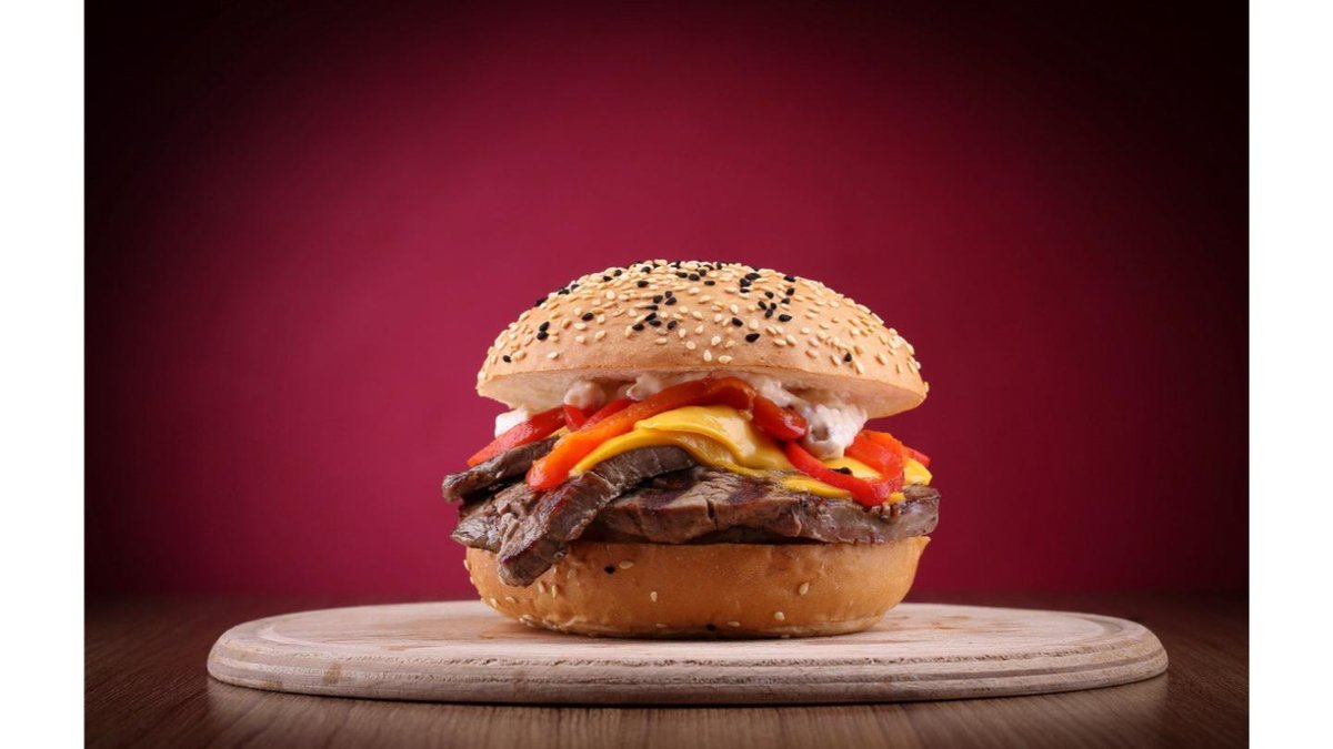 Стейк мясо без кости, чеддер сыр, грибы, карамелизованный лук, айсберг, помидор, соленый огурец, густо соус, перец болгарский, булочка