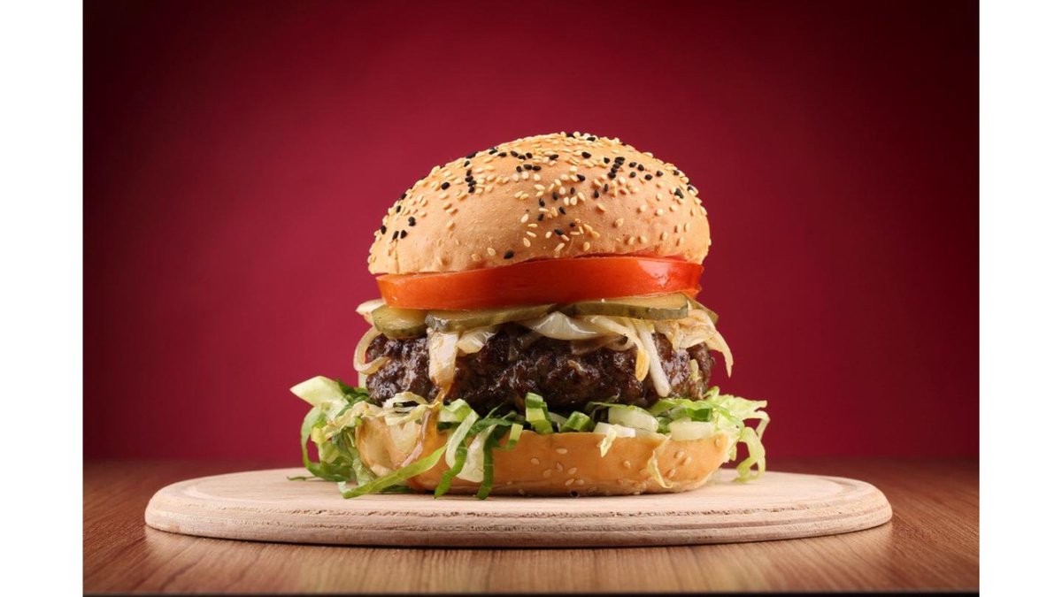 Говяжья котлета, карамелизованный лук, айсбер, помидор, соленый огурец, густо соус, болгарский перец на гриле, булочка, соус барбекю