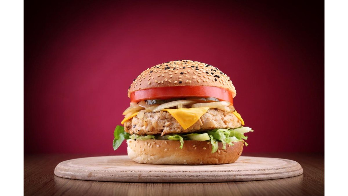 Куриная котлета, карамелизованный лук, айсбер, помидор, соленый огурец, густо соус, болгарский перец на гриле, булочка, сыр чеддер