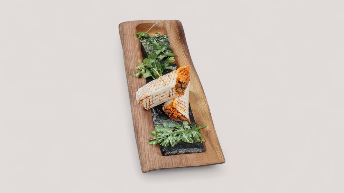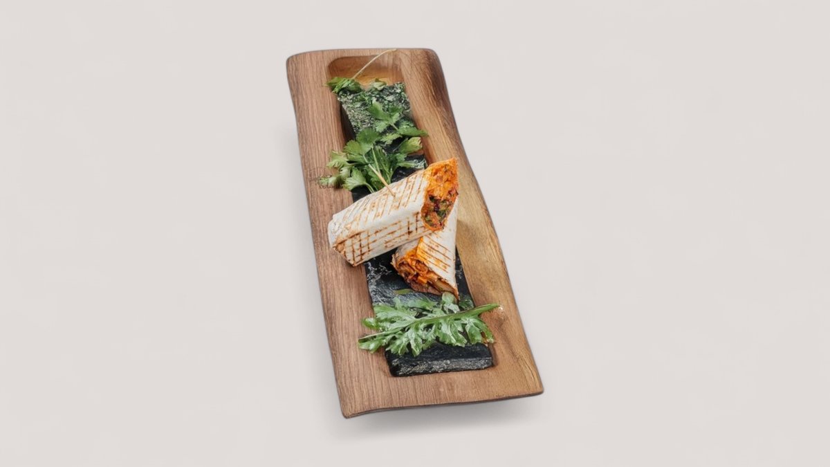 Куриная котлета, халапеньо, фирменый острый соус, карамелизованный лук, айсбер, помидор, соленый огурец, густо соус, болгарский перец на гриле, булочка, сыр чеддер