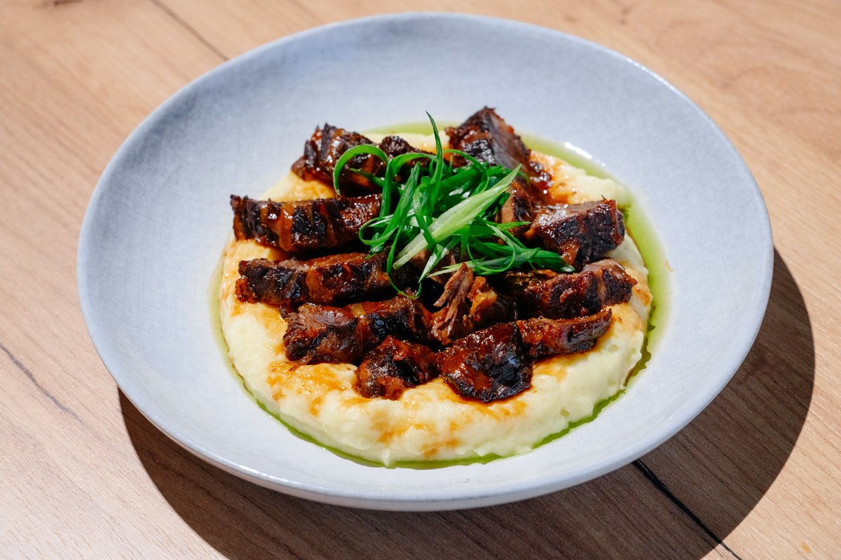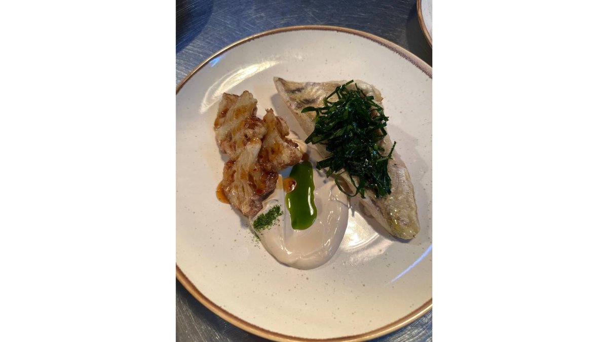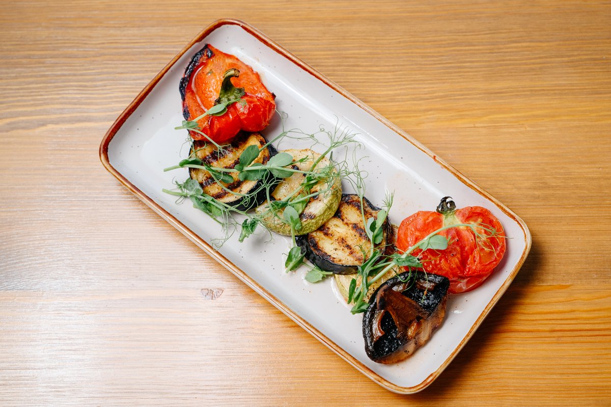 баклажаны, томаты, мусс из греческого сыра, соус унаги, кинза