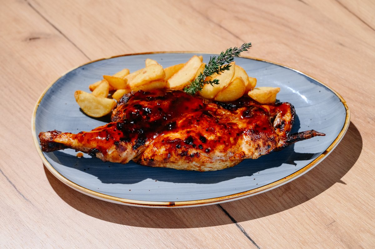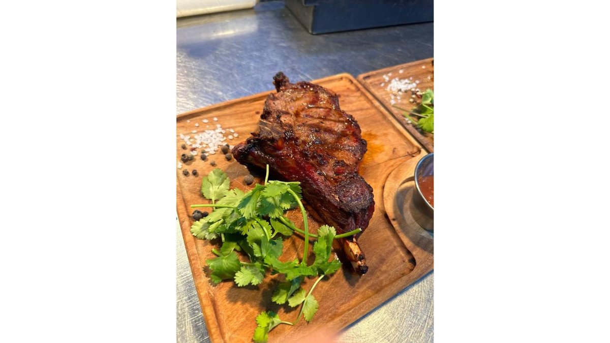стейк Рибай, огручики маринованные в бурбоне, соус Colibri, зелень, специи