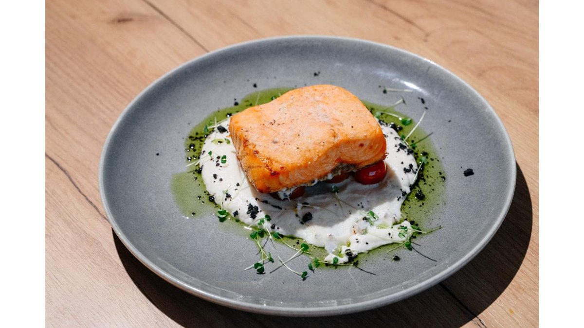 лосось, бобы эдомаме, мусс из цветной капусты, шпинат, соус беарнез