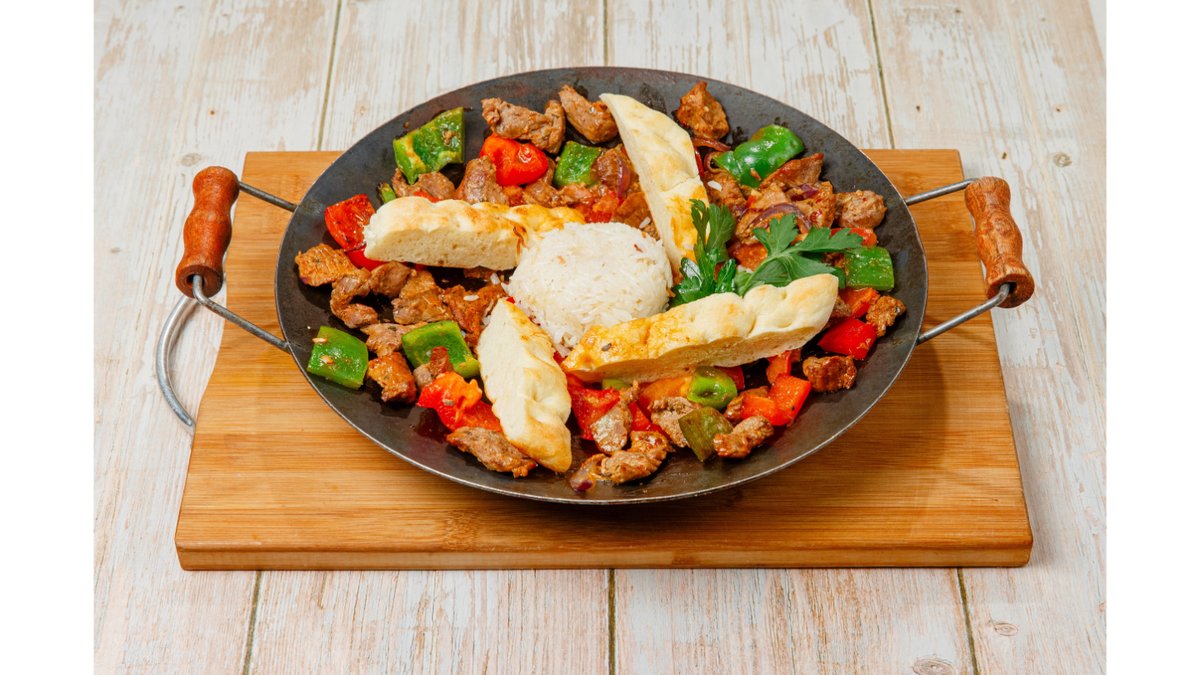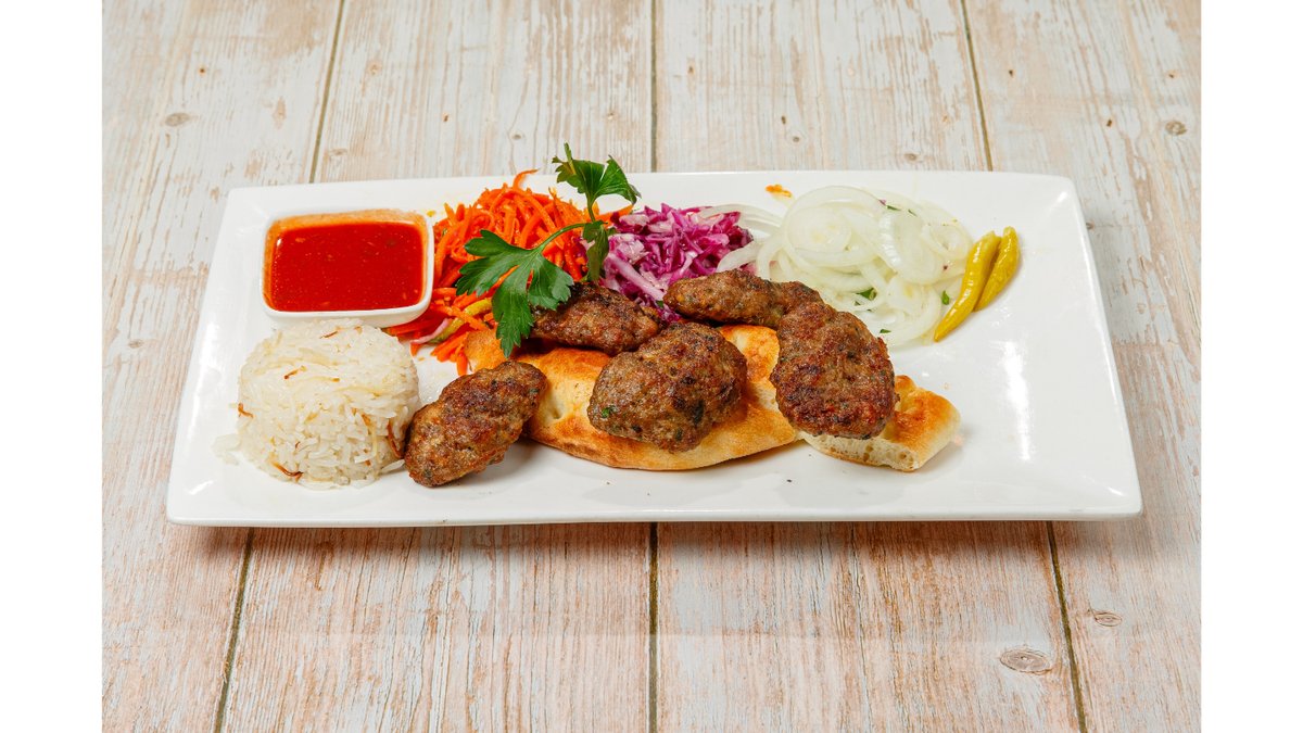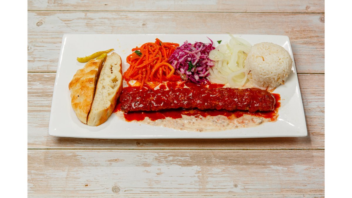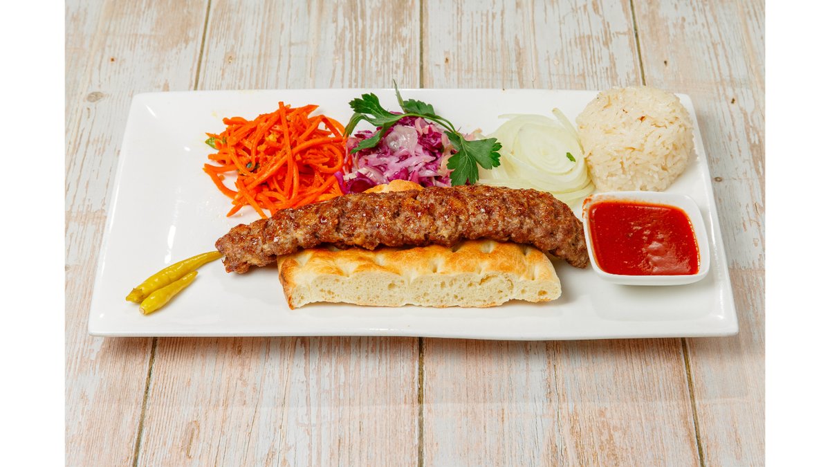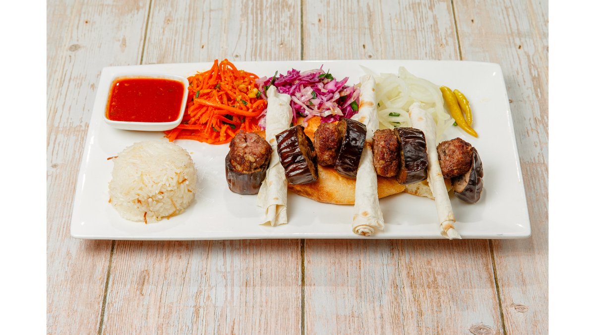 рубленная говядина с курдюком, баклажан, рис, салат из моркови, красная капуста, лук, турецкий хлеб и шашлычный соус. 450 г
