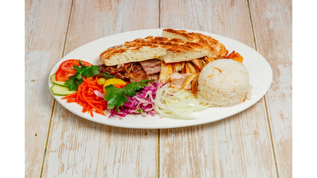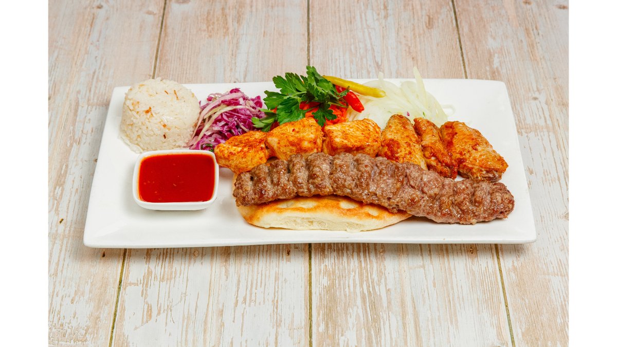 рубленная говядина с курдюком, куриные крылышки, куриный шашлык, рис,салат из моркови, красная капуста, лук, турецкий хлеб и шашлычный соус. 450г