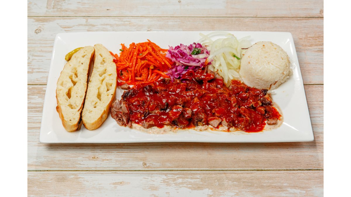 рубленная говядина с курдюком, соус набитые баклажаны,рис, алат из моркови,красная капуста, лук, турецкий хлеб и соус искендер. 450 г