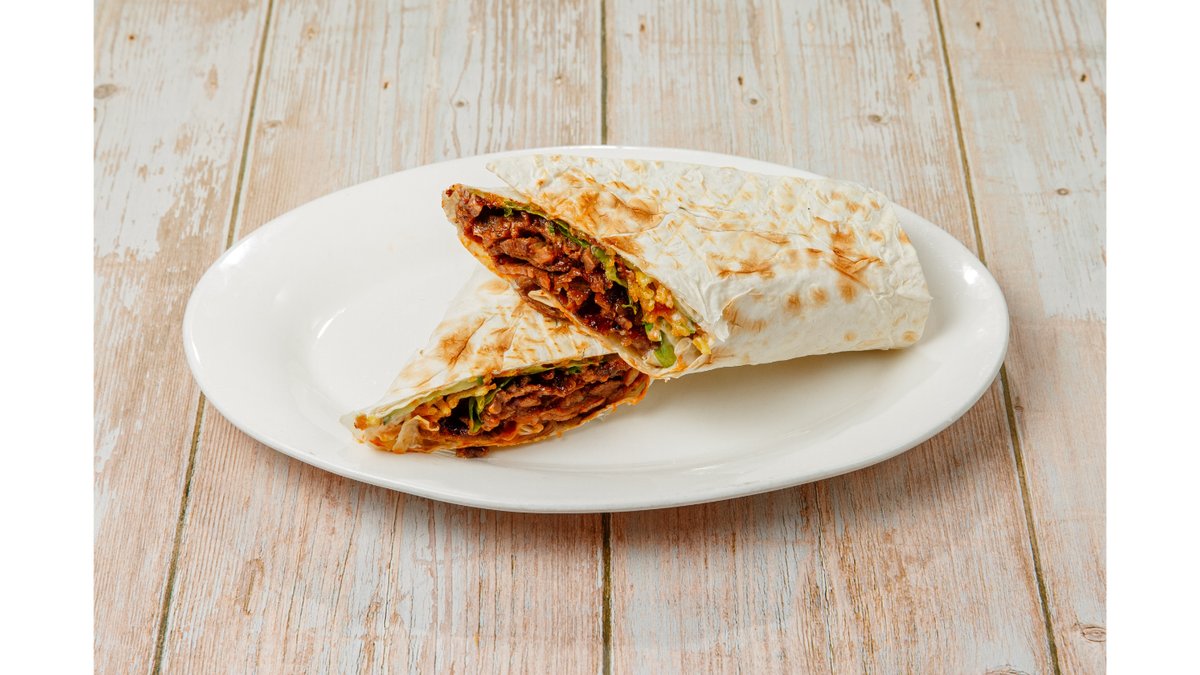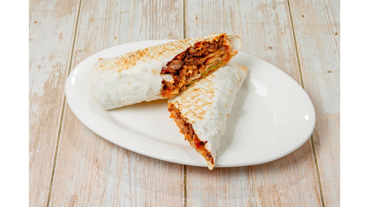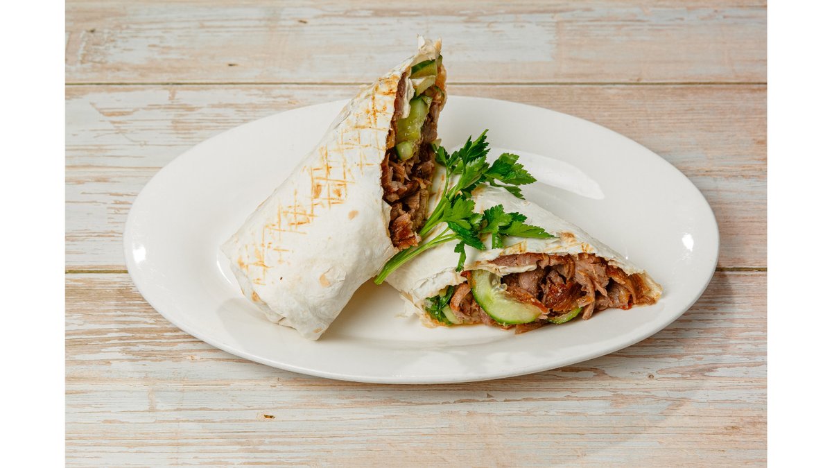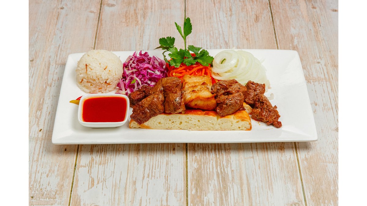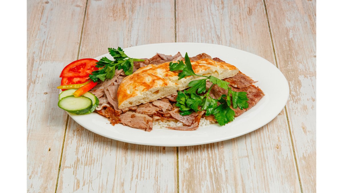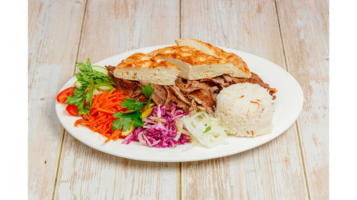Мясо баранины, рис, салат из моркови, красная капуста, лук, турецкий хлеб и шашлычный соус. 450г