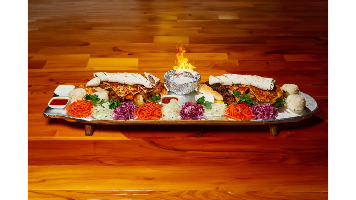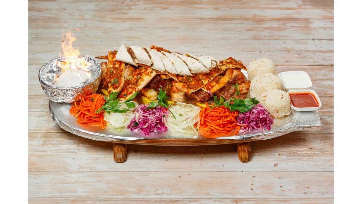 адана кебап, симит кебап, патлыжан кебап, куриный шашлык, крылышки, шашлык из баранины, лахмажун, рис, салат из моркови, красная капуста, лук, шашлычный соус. 1000г