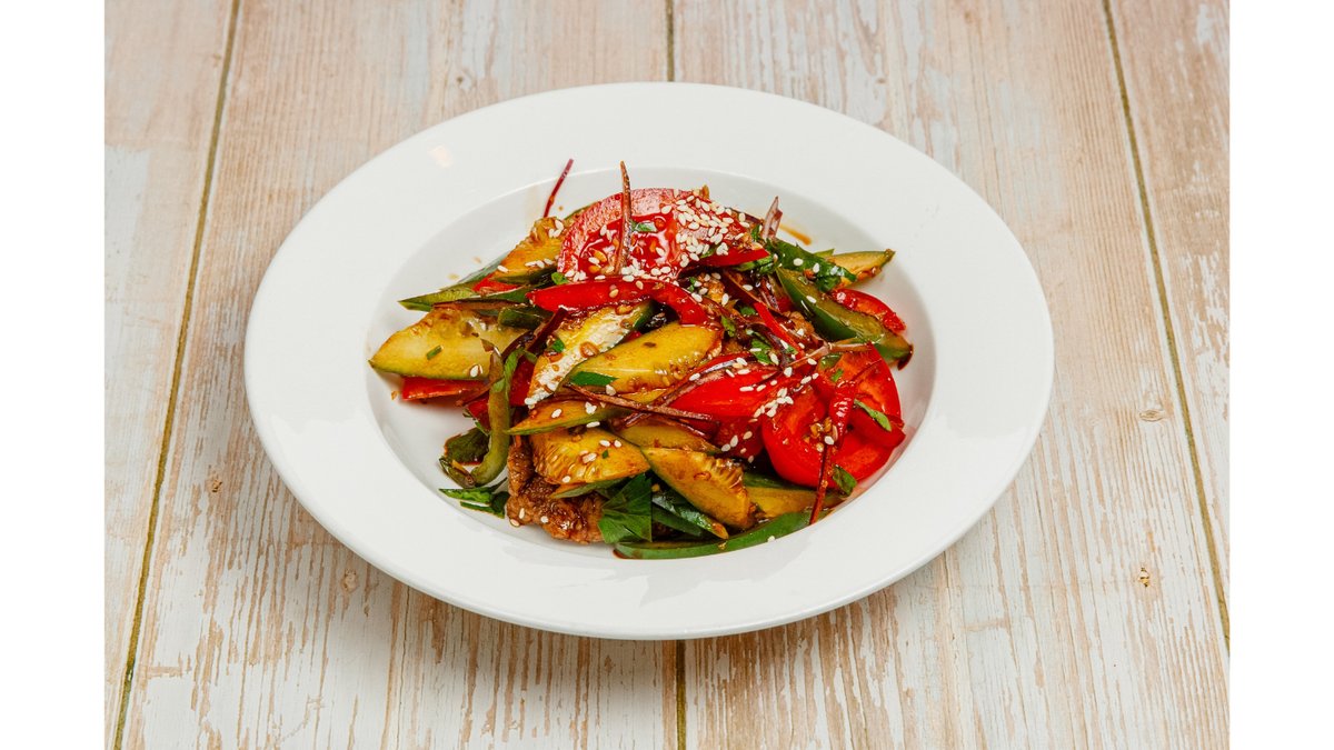 телятина, помидоры,огурцы, болгарский перец, лук репчатый, чеснок, соевый соус, кунжут. 200 г