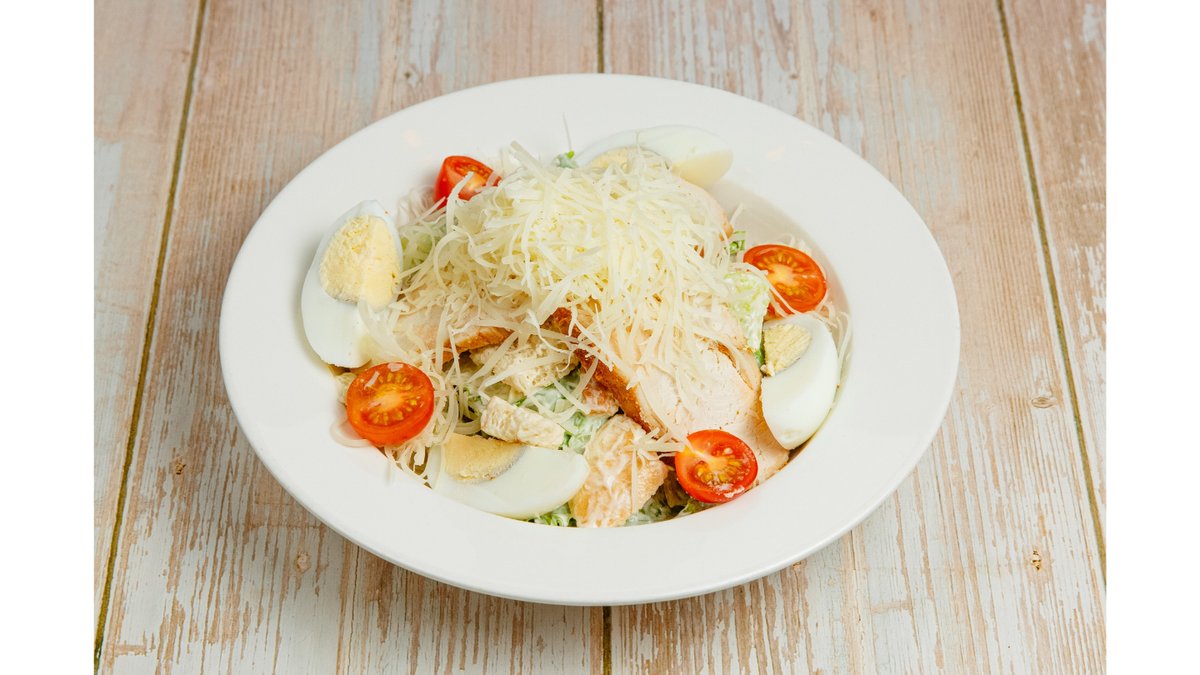 куриное филе, салатные листья, айсберг,яйцо куриное, помидоры черри,соус цезарь,пармезан. 300 г