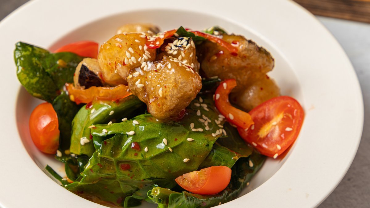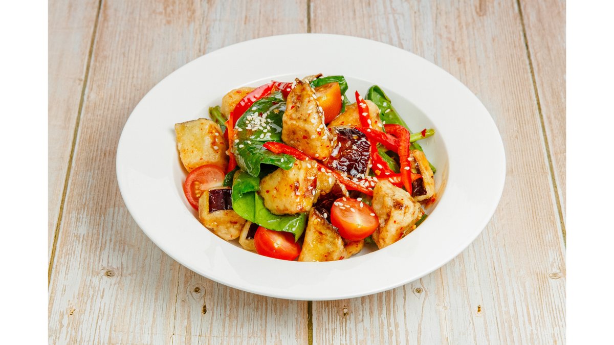 баклажан,листья шпината, помидоры черри, соус сладкий чили,кунжут. 300 г