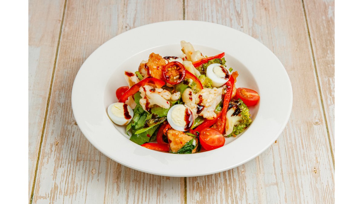 куриные кусочки,брокколи,цветная капуста,болгарский перец,листья шпината,помидоры черри,перепелиное яйцо,соус сладкий чили. 300 г