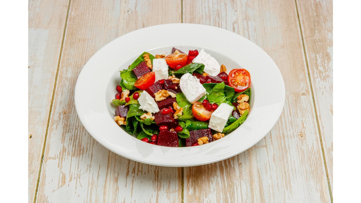 свекло,листья шпината,сыр фета, грецкий орех, зерна граната, соус гранатовый. 200 г