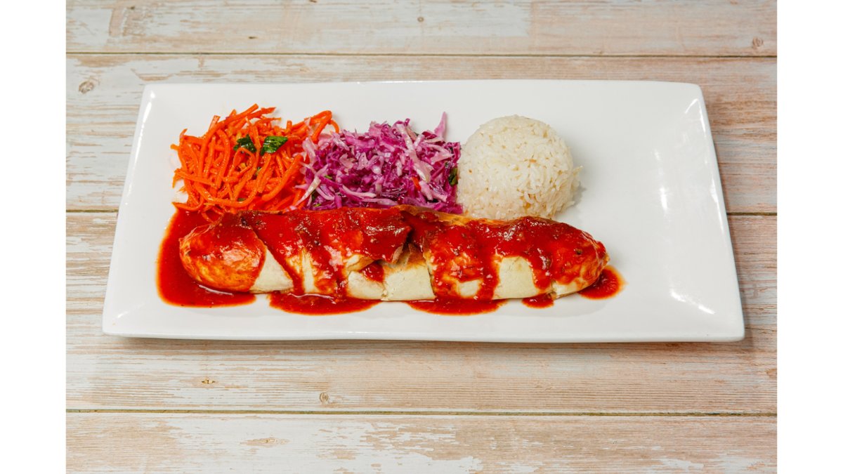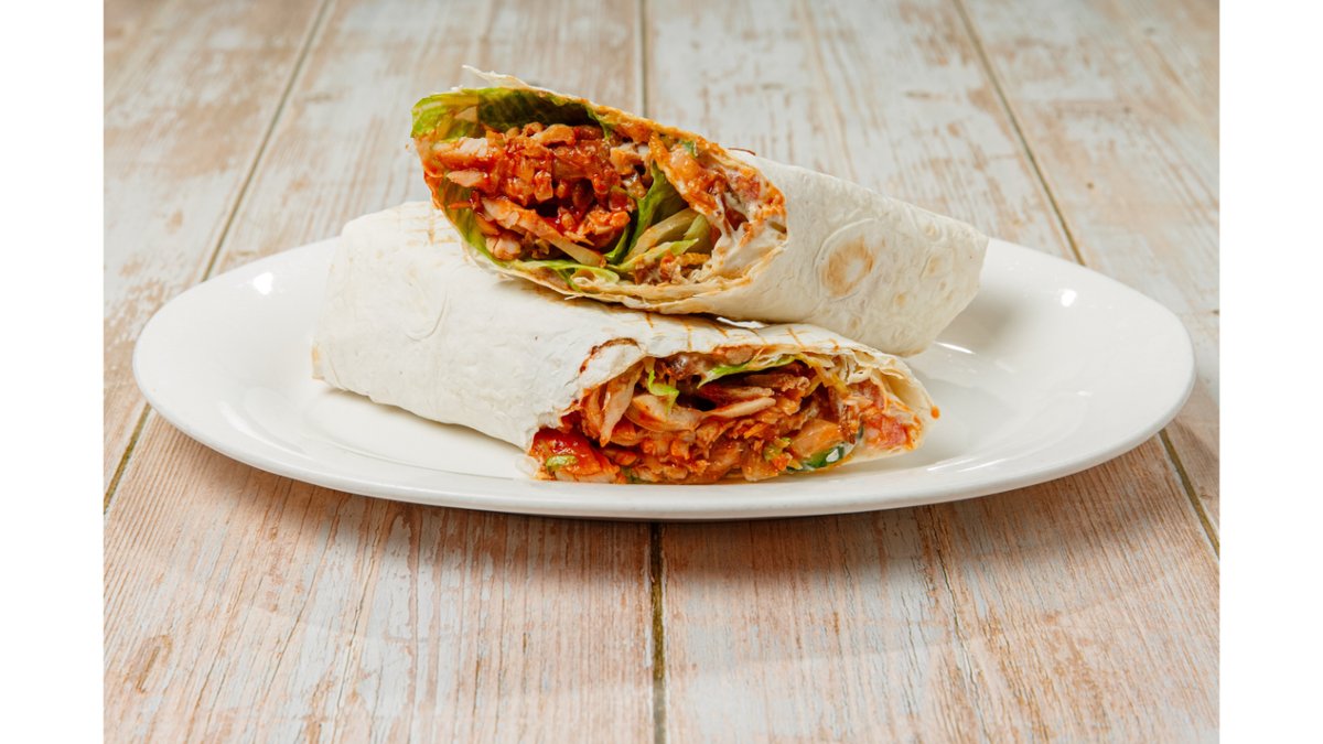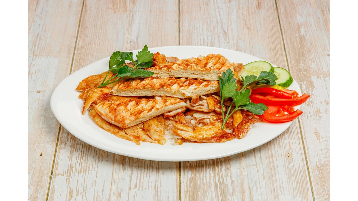 Филе курицы, рис, салат из моркови, красная капуста, лук, турецкий хлеб и шашлычный соус. 450 г