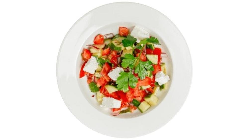 помидоры,огурцы,болгарский перец,листья салата,сыр фета,оливки, маслины, соус. 250 г