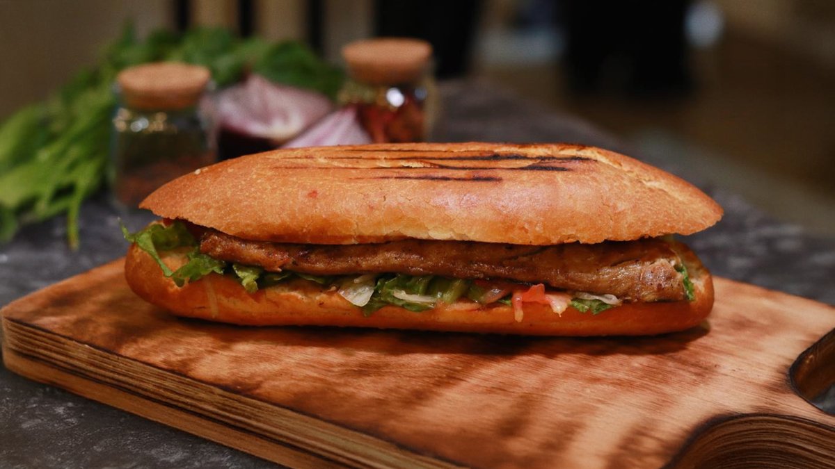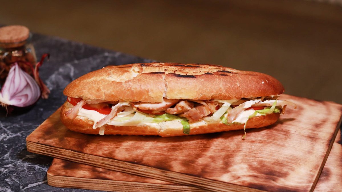 Турецкая булка, филе скумбрии на гриле, помидоры, огурец, красный лук, айсберг, лимонная заправка. 400 гр