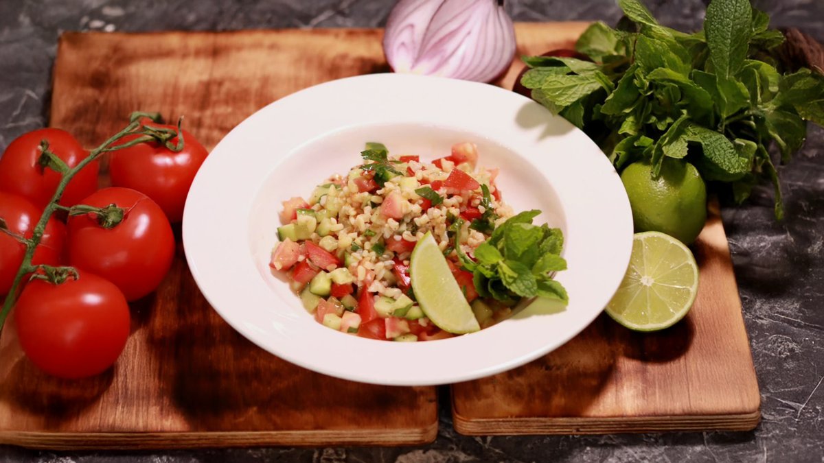 Помидоры, огурец, булгур, красный лук, мята, петрушка, оливковое масло, лайм. 250 гр