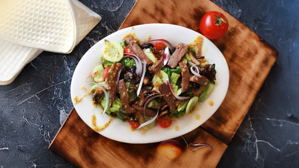 Айсберг, шпинат, лола росса, лист салата, обжаренная телятина и шампиньоны, помидоры черри, огурец, красный лук, медово горчичная заправка. 350 гр