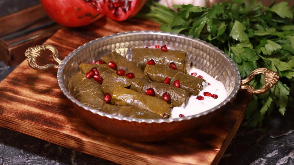 виноградные листья, говядина рубленная, рис, репчатый лук, курдючный жир, соус мацони, гранат. 400 гр