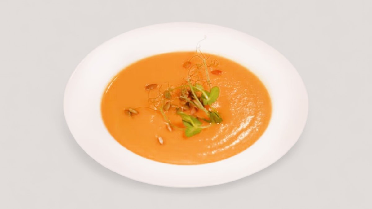 тыква, картофель, репчатый лук, морковь, сливочное масло, тыквенные семечки. 350 гр