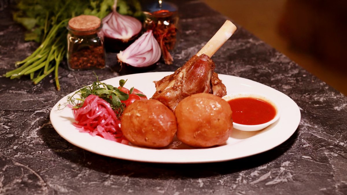 голень ягненка, картофель, маринованный красный лук, помидоры черри. 600гр