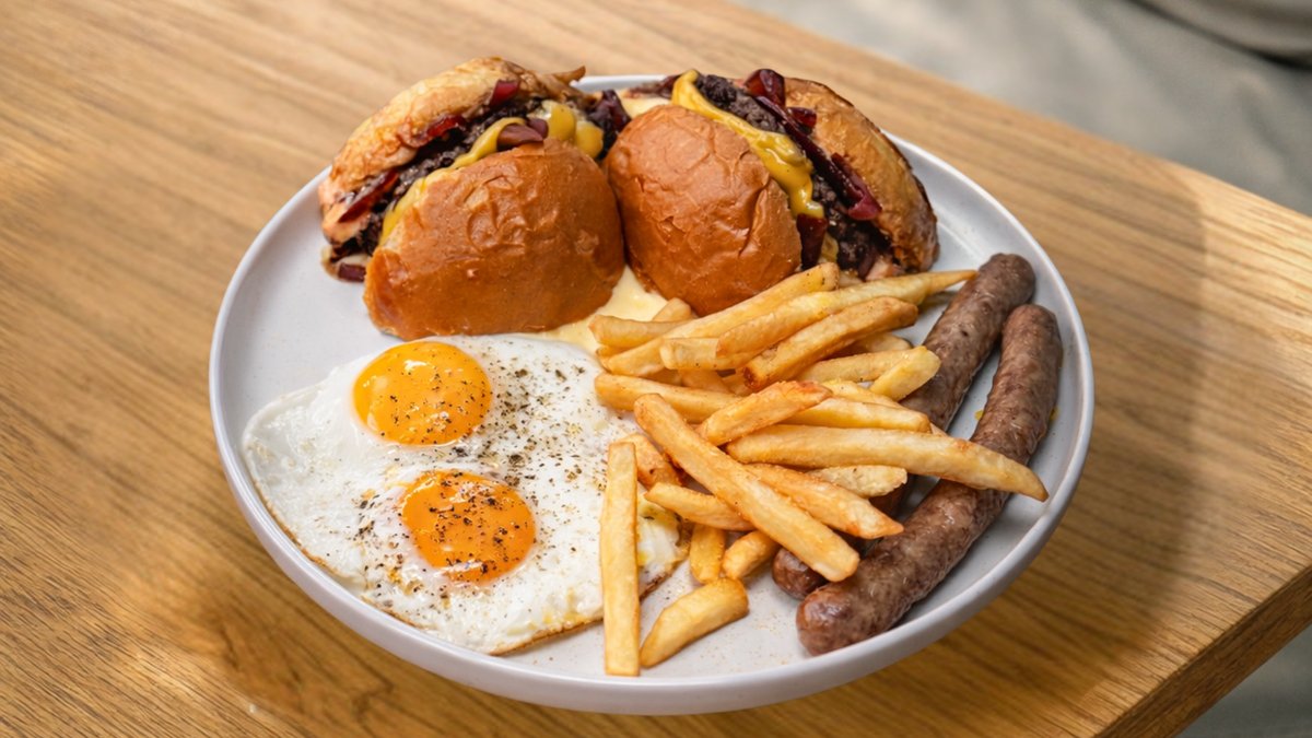 Сочный бургер, хрустящий картофель фри, яичница с нежным желтком и ароматные говяжьи колбаски. Классическое сочетание для плотного, энергичного и по-настоящему вкусного завтрака