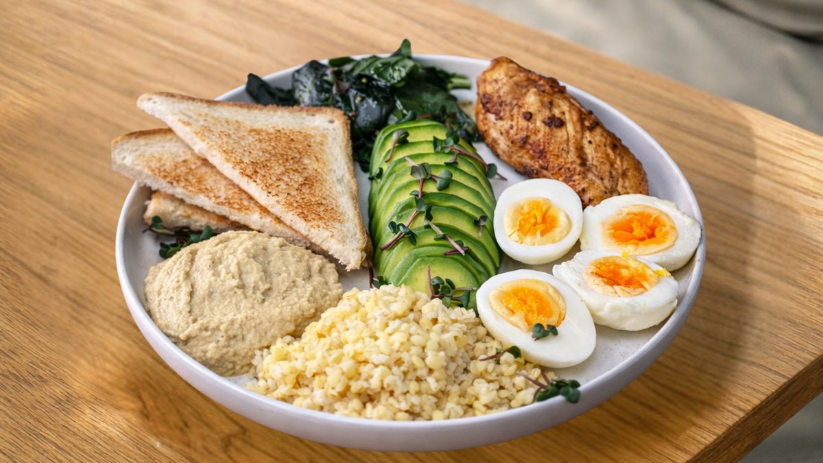 Сбалансированный завтрак с акцентом на белок, полезные жиры и сложные углеводы. Сочная куриная грудка и яйца дают сытость, авокадо и хумус добавляют кремовую текстуру и пользу, булгур отвечает за энергию. Идеальный вариант для правильного и вкусного приема пищи.