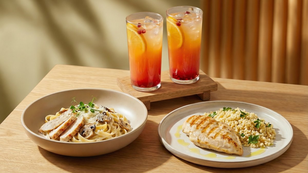 Нежная паста фетучини с курицей в сливочном соусе и сочный стейк из курицы с булгуром создают полноценный и сбалансированный дуэт. Освежающий лимонад 450 мл апельсин-гранат добавляет яркий цитрусовый акцент и идеально завершает обед или ужин для двоих
