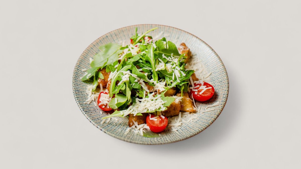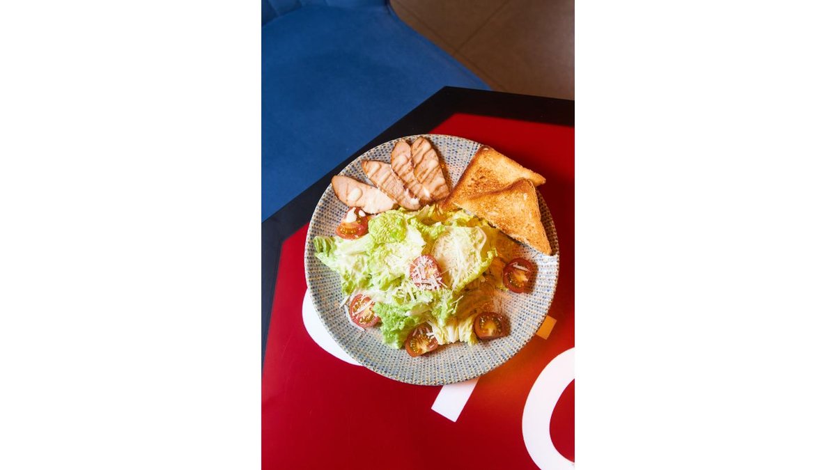 Куриная грудка, гренки, помидор, сыр пармезан, лист салата/Тауықтың төс еті, крутон, қызанақ, пармезан ірімшігі, салат жапырағы, ірімшік сарымсақ соусы