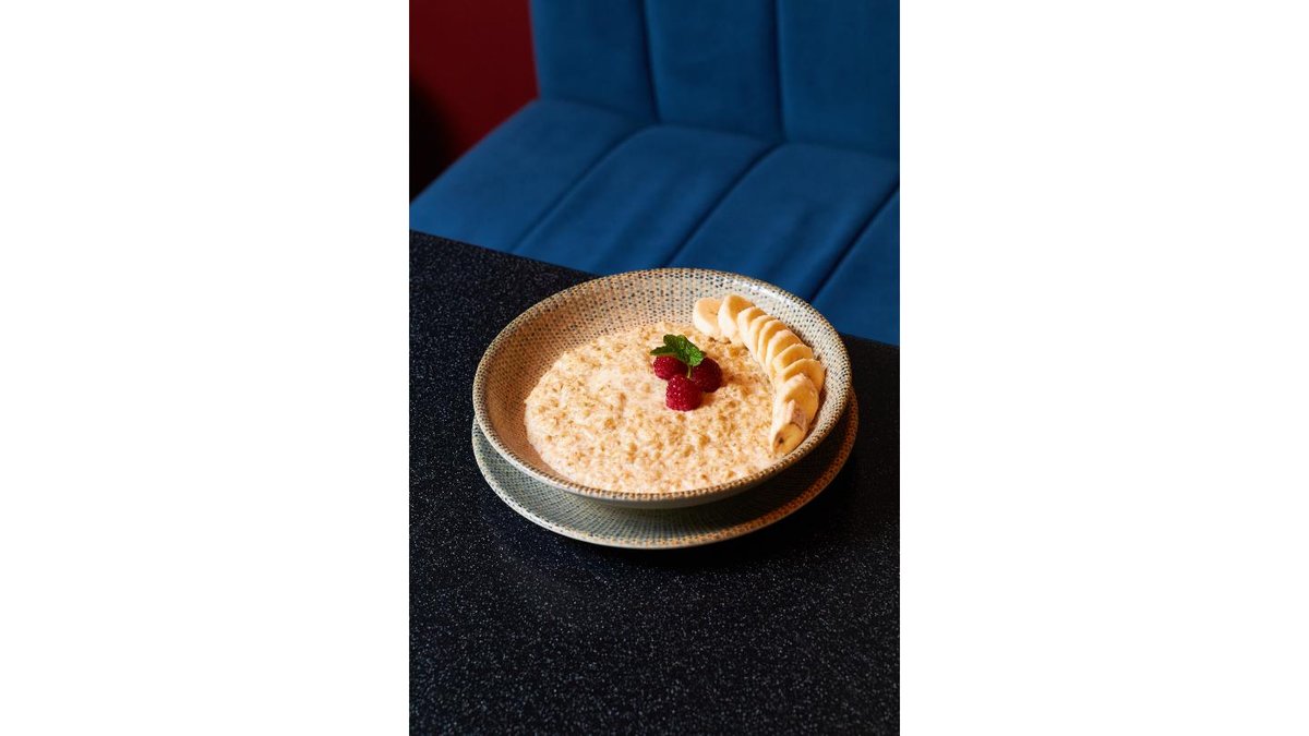 Овсяные хлопья, молоко, сахар, банан, малина, масло сливочное/Сұлы үлпегі, сүт, қант, банан, таңқурай, сары май